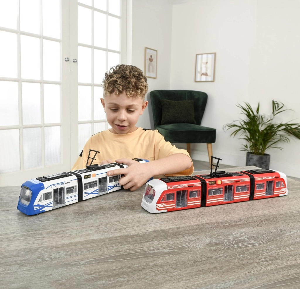 El tranvía está disponible en dos variantes de color: rojo y azul. Gracias a las 3× pilas AAA incluidas, el juguete está listo para usar de inmediato, garantizando horas de diversión para tu hijo. Apto para niños a partir de 3 años.