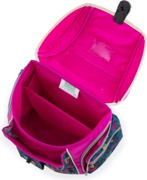La organización interior inteligente con separador, el gran compartimento principal y los numerosos bolsillos mantienen el material escolar ordenado y a mano. El sencillo cierre magnético facilita el uso diario. El set se completa con una práctica bolsa para educación física/zapatos con cierre de cordón y un estuche de una sola planta con dos solapas (sin contenido), con presillas elásticas y lámina transparente para el horario.
