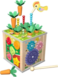 Descubre un juguete divertido e inteligente para niños a partir de 3 años: un cubo sensorial educativo de madera 6 en 1 que desarrolla la motricidad fina, el pensamiento lógico y la coordinación mano-ojo. Ofrece seis actividades en una: desde extraer “zanahorias”, clasificar formas, platillos/xylofón con sonido, engranajes, hasta una esfera de reloj didáctica. Gracias al espacio interior de almacenamiento, el juguete es práctico y enseña a los niños el orden. Fabricado en madera de calidad, con énfasis en la seguridad y la durabilidad.