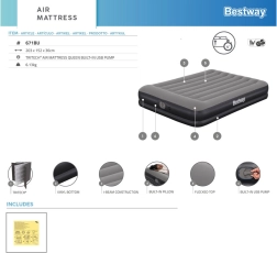 La bomba USB integrada llena la cama en 5–6 minutos y es compatible con adaptadores AC/DC y powerbanks, ideal cuando estás de viaje. La almohada integrada y la agradable superficie acanalada aumentan el confort al dormir; el tamaño de 152 × 203 cm aloja cómodamente a dos adultos.