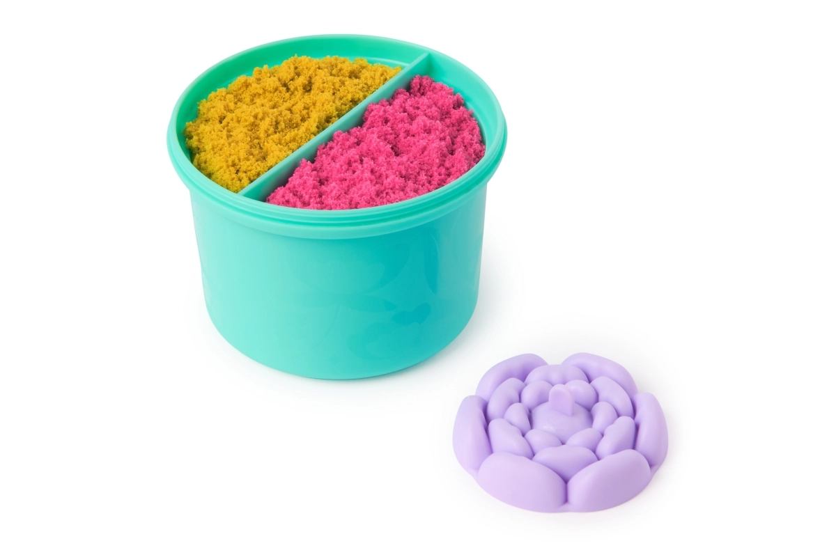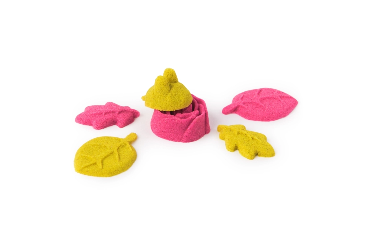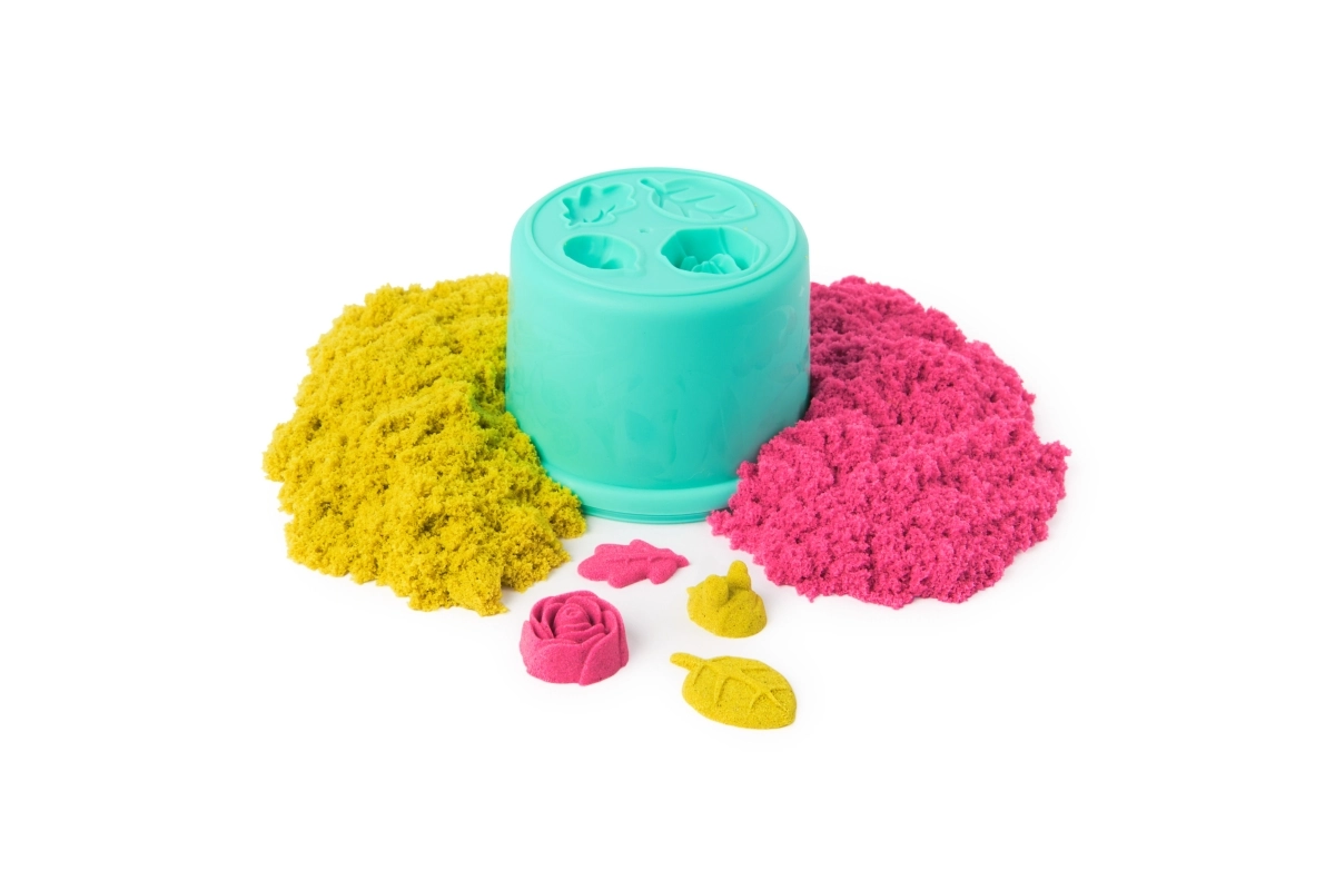 - 240 g de arena cinética (rosa neón y amarilla), maceta con base blanda, molde superior de flor, moldes para rosas, abejas y hojas