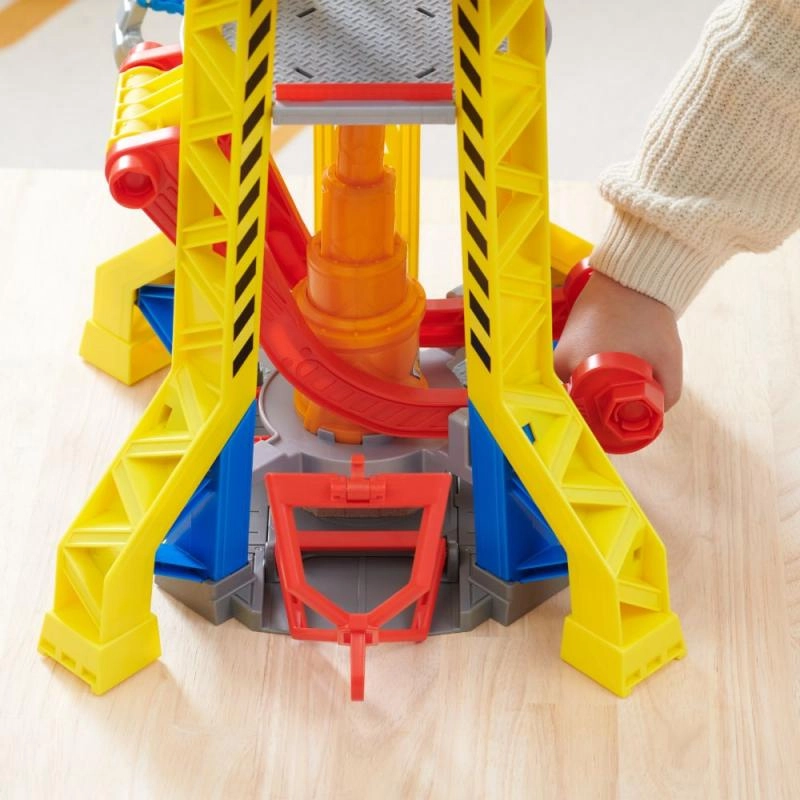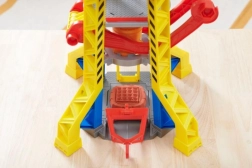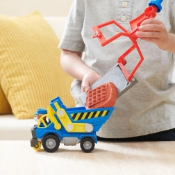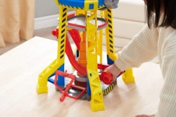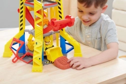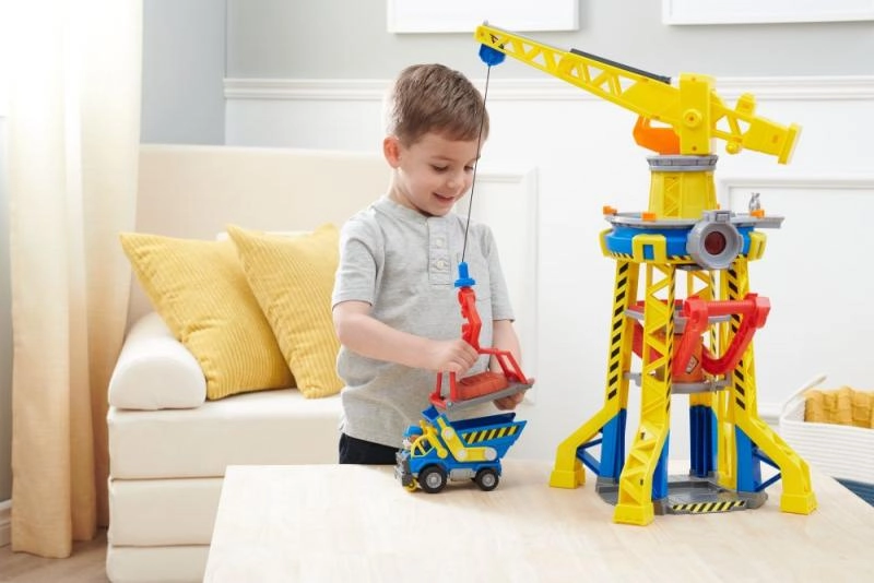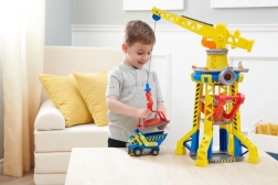 Coloca a Rubble en el ascensor y súbelo a la cima de la torre, hasta la cabina de control de la grúa. Usa la grúa para levantar los bloques y moverlos al lugar correcto. Para más sorpresas, pulsa el gran botón rojo de la torre para encender las luces y escuchar sonidos conocidos de la serie. Para más diversión, busca otros camiones de construcción y figuras de la línea Rubble & Crew.