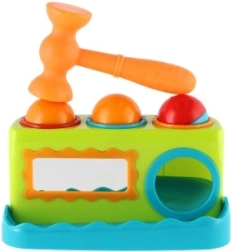 - Banco de golpear, 3 pelotas de colores, martillo de plástico