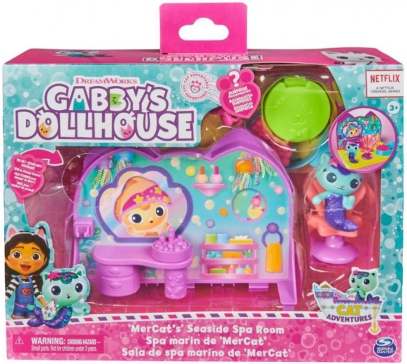 Explora nuevas posibilidades de juego con la Habitación de spa de Sirenita de La Casa Mágica de Gabby. Este set incluye una preciosa figura de Sirenita de casi 5 cm y su bañera de burbujas favorita. Después del baño, Sirenita puede relajarse en la silla de spa giratoria.