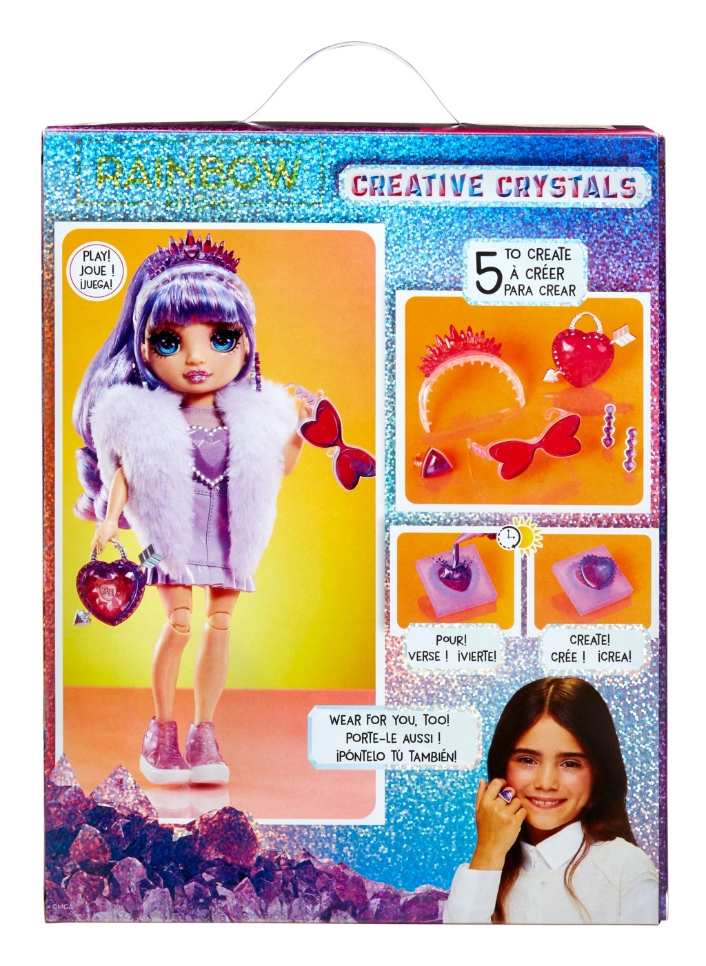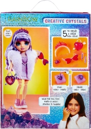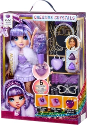 Descubre la magia de la moda y la creación con la muñeca Rainbow High Creative Crystals Violet Willow. Con la resina y los moldes incluidos podrás hacer más de 5 accesorios de cristal para la muñeca y un anillo para ti. La muñeca tiene articulaciones móviles y cabello peinable, ideal para estilismo y juego creativo.