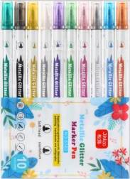 Ilumina tus creaciones con un set de 10 rotuladores metálicos de doble punta con purpurina. Ofrecen brillo metálico intenso, dos anchos de punta (fina y más ancha) y tinta rápida de secado y no tóxica para trazos limpios sin manchas. Ideales para papel, cartón, plástico y cerámica — para dibujar, caligrafía y decoración.