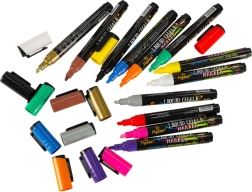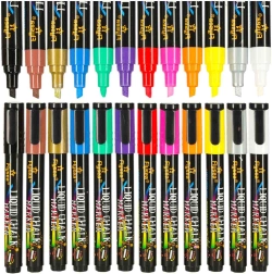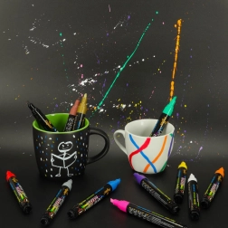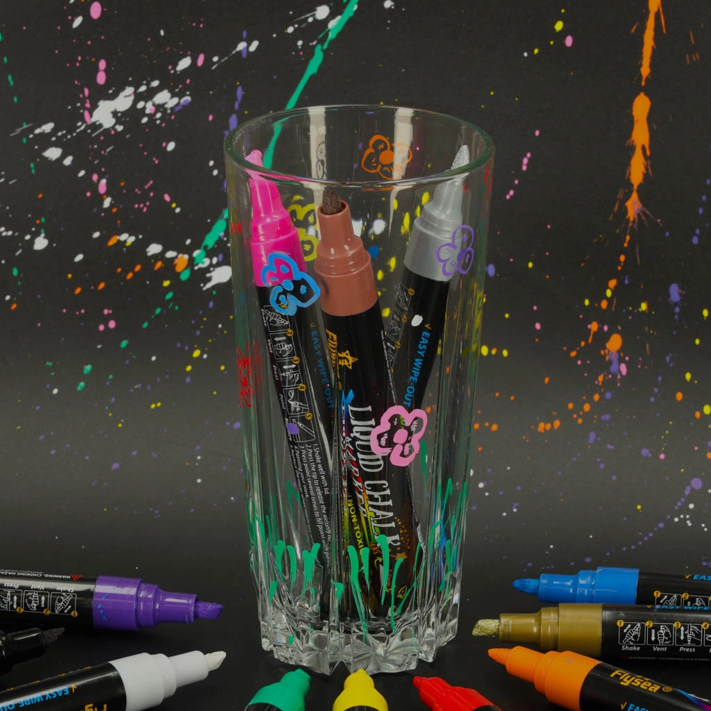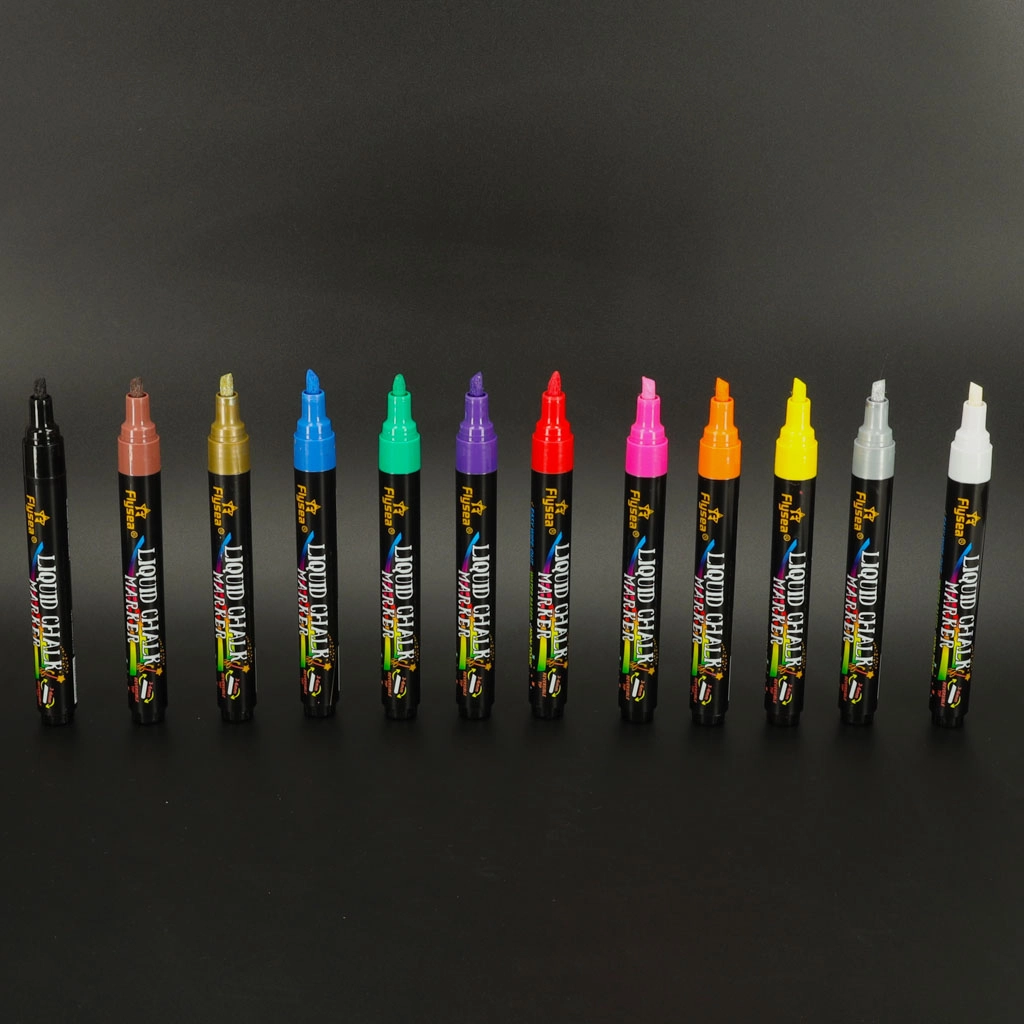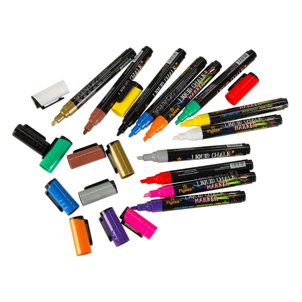 En el paquete encontrarás 12 tonos intensos incluyendo blanco, negro, dorado y plateado: perfectos para resaltar y decorar. Los rotuladores son sin polvo, no tóxicos y adecuados para uso repetido en vidrio, pizarras, escaparates, tazas de cerámica y superficies de plástico.