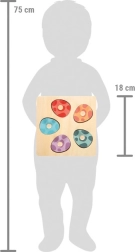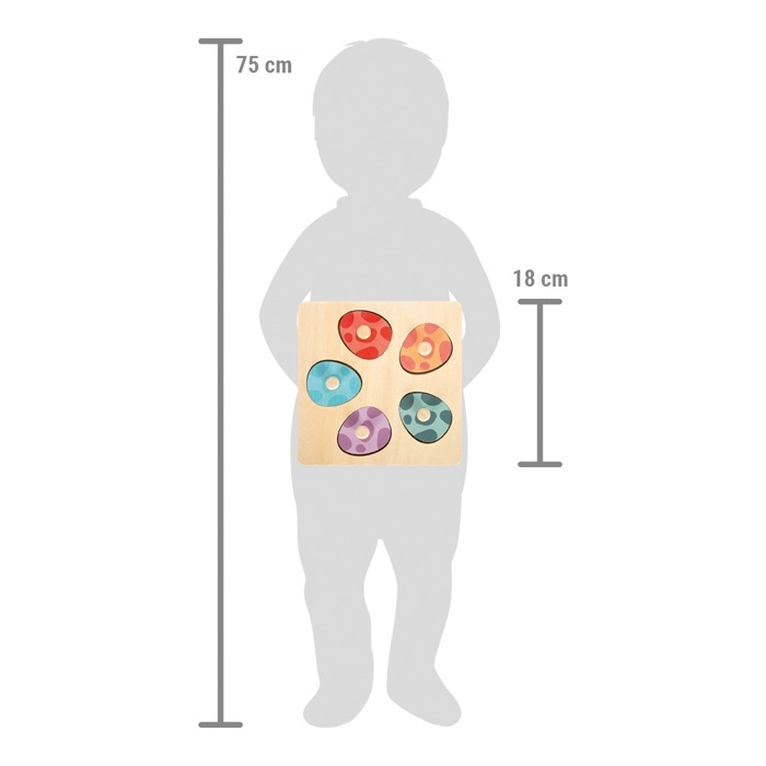 Este robusto juguete de madera en colores vivos encantará a todos los pequeños amantes de los dinosaurios. Bajo seis huevitos se esconden seis dinosaurios de madera en colores correspondientes, por lo que los niños pueden entrenar la memoria y la asociación. El juego es ideal como primera aproximación a los puzzles gracias a los prácticos pomos tipo botón.