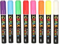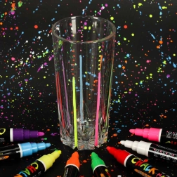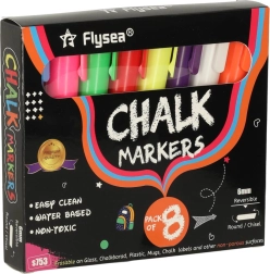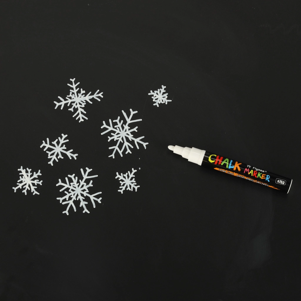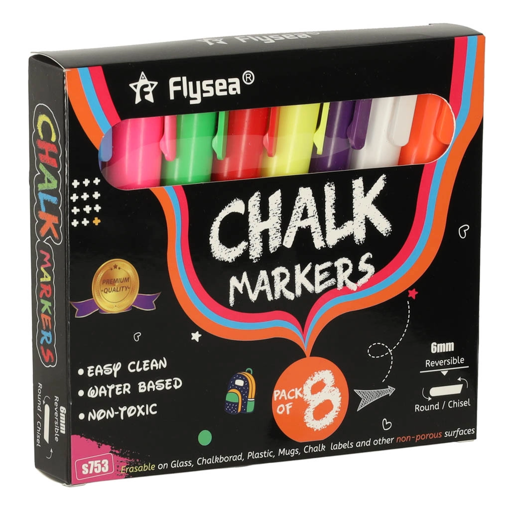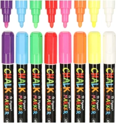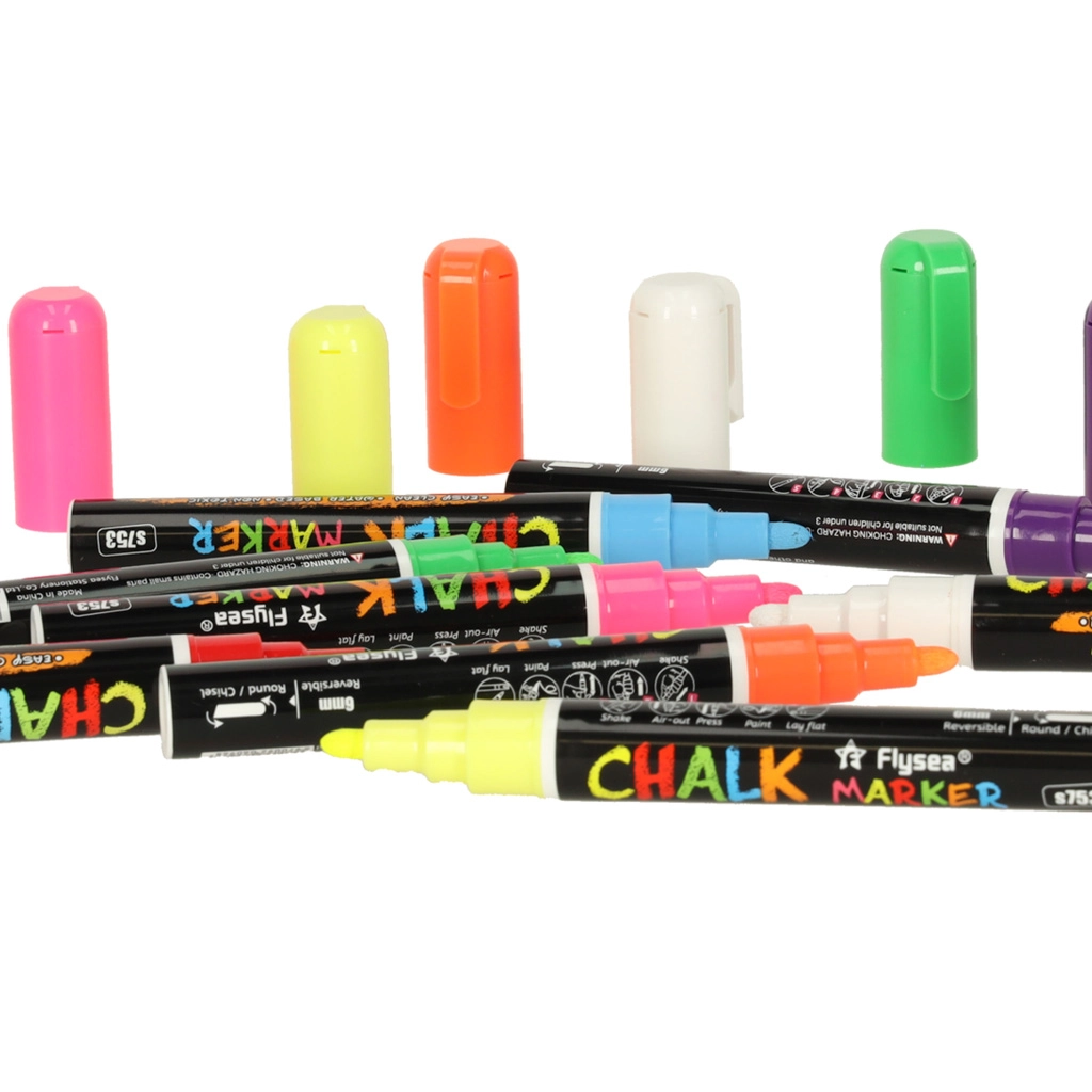 Cada rotulador tiene una punta doble (redonda y biselada) que puede girarse según sea necesario, lo que garantiza precisión y variedad en las líneas creadas. La tinta a base de tiza y agua no deja marcas; basta con usar un paño húmedo para retirarla, sin manchas ni residuos. Además, no ensucia las manos ni genera polvo como la tiza tradicional.