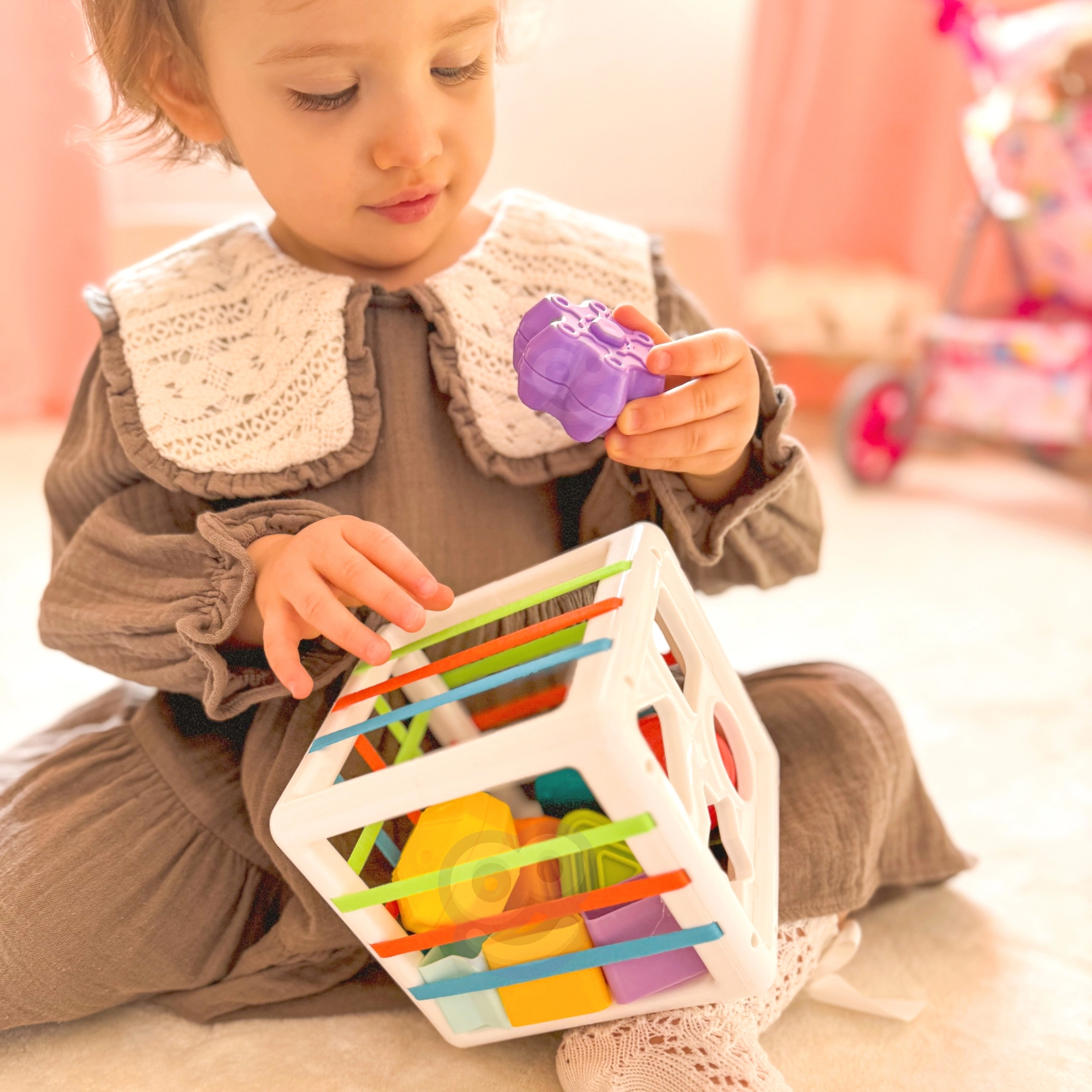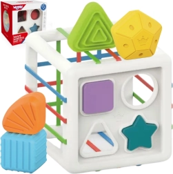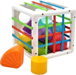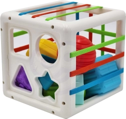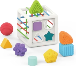 Este colorido cubo sensorial combina dos actividades favoritas: insertar piezas a través de bandas elásticas y clasificar en aberturas con forma. Los niños aprenden a reconocer colores y formas geométricas, desarrollan la curiosidad y la capacidad de concentración. Las piezas sólidas se agarran con facilidad y el cubo tiene una construcción práctica para transportarlo y guardarlo cómodamente.