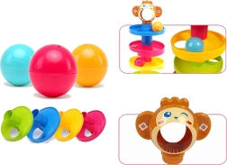 Las pelotas de colores con sonidos de sonajero ayudan a estimular los sentidos y la coordinación.