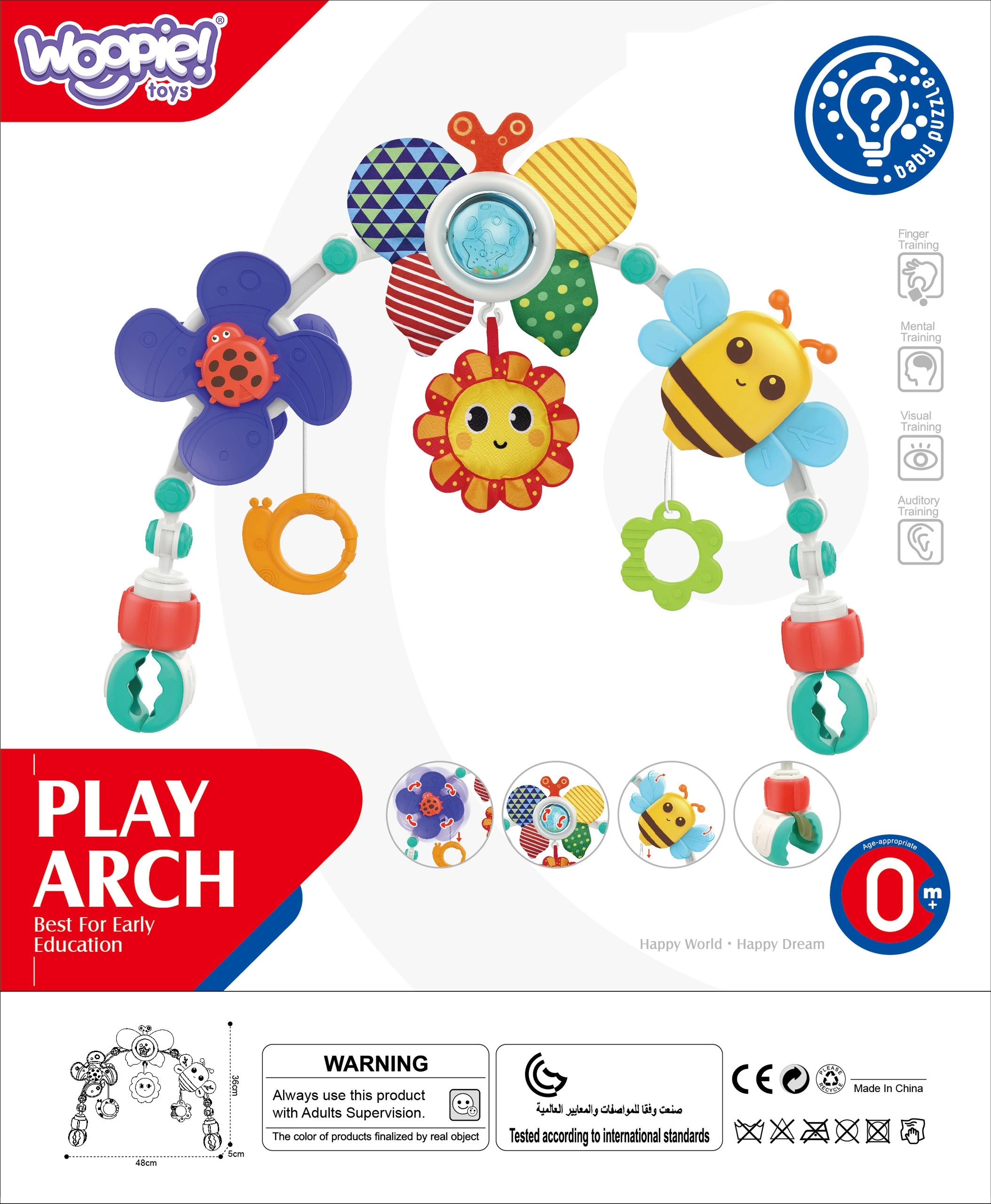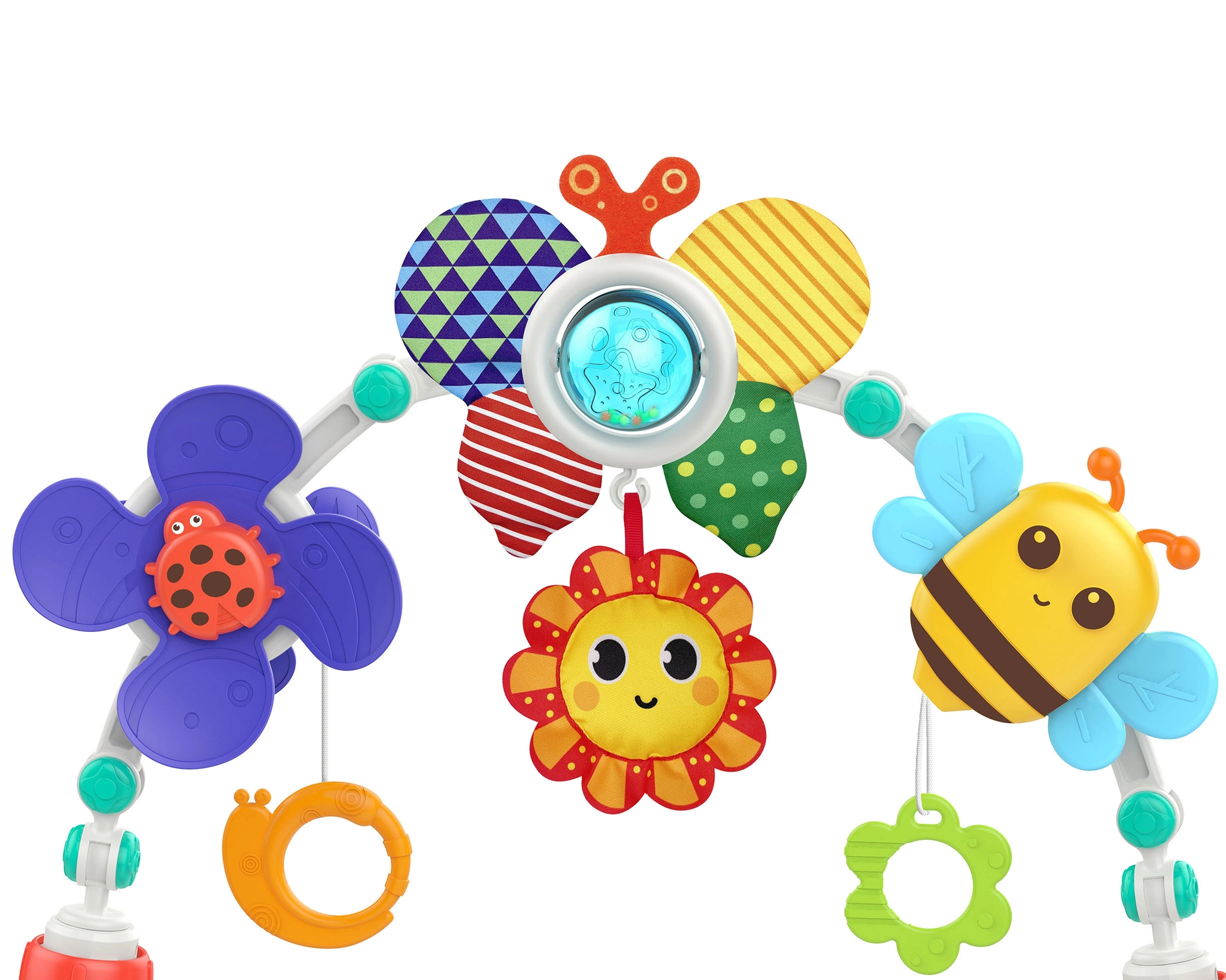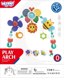 El arco con juguetes WOOPIE está diseñado para ofrecer no solo diversión, sino también desarrollo. En el arco encontrarás diversos juguetes, como un molinillo con mariquita que gira y vibra al moverse, un sol que emite un pitido al presionarlo, un sonajero mariposa con una bola transparente en la que saltan bolitas de colores, y materiales crujientes que enriquecen la experiencia sensorial del bebé.