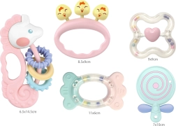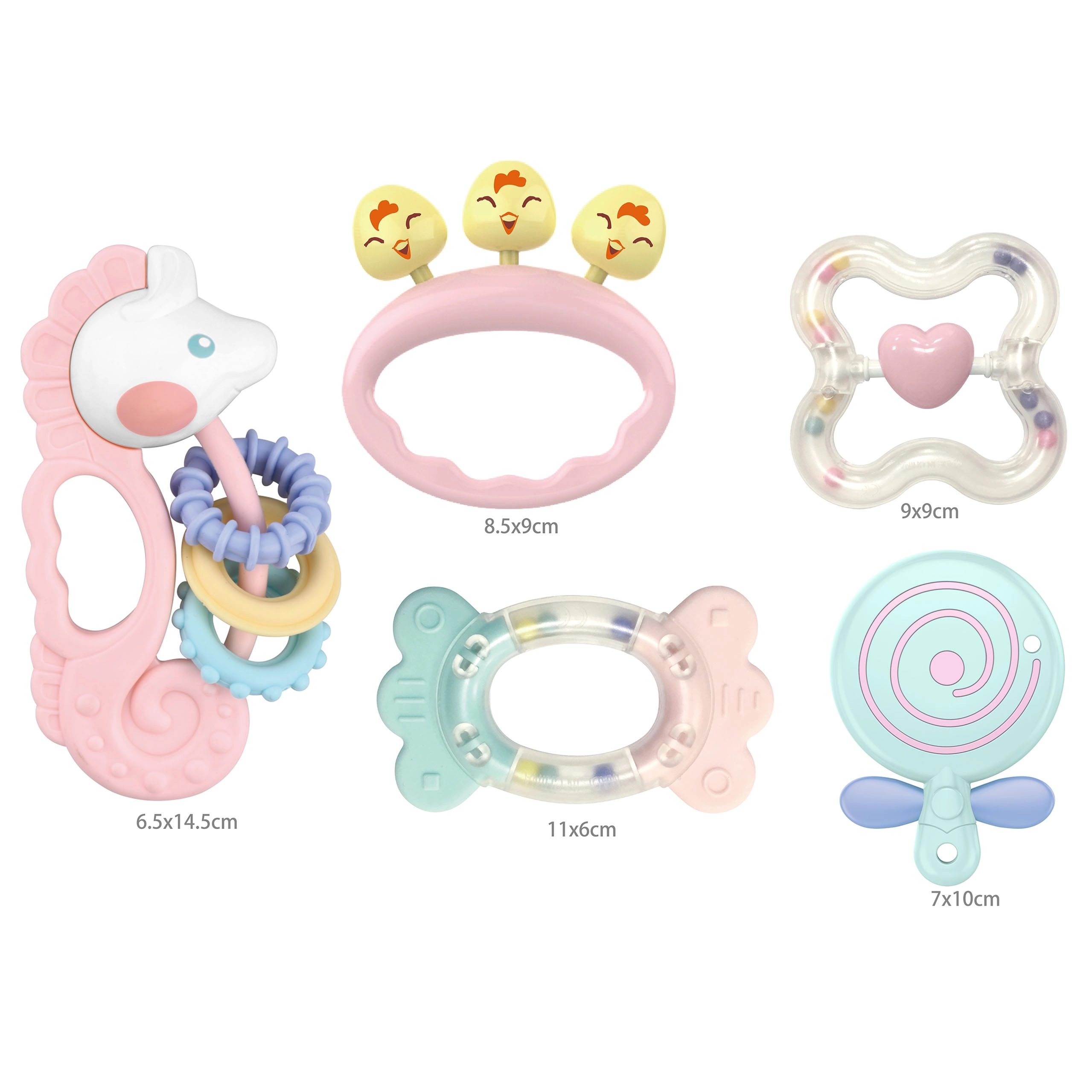 - 5 mordedores–sonajeros diferentes para una estimulación variada