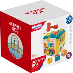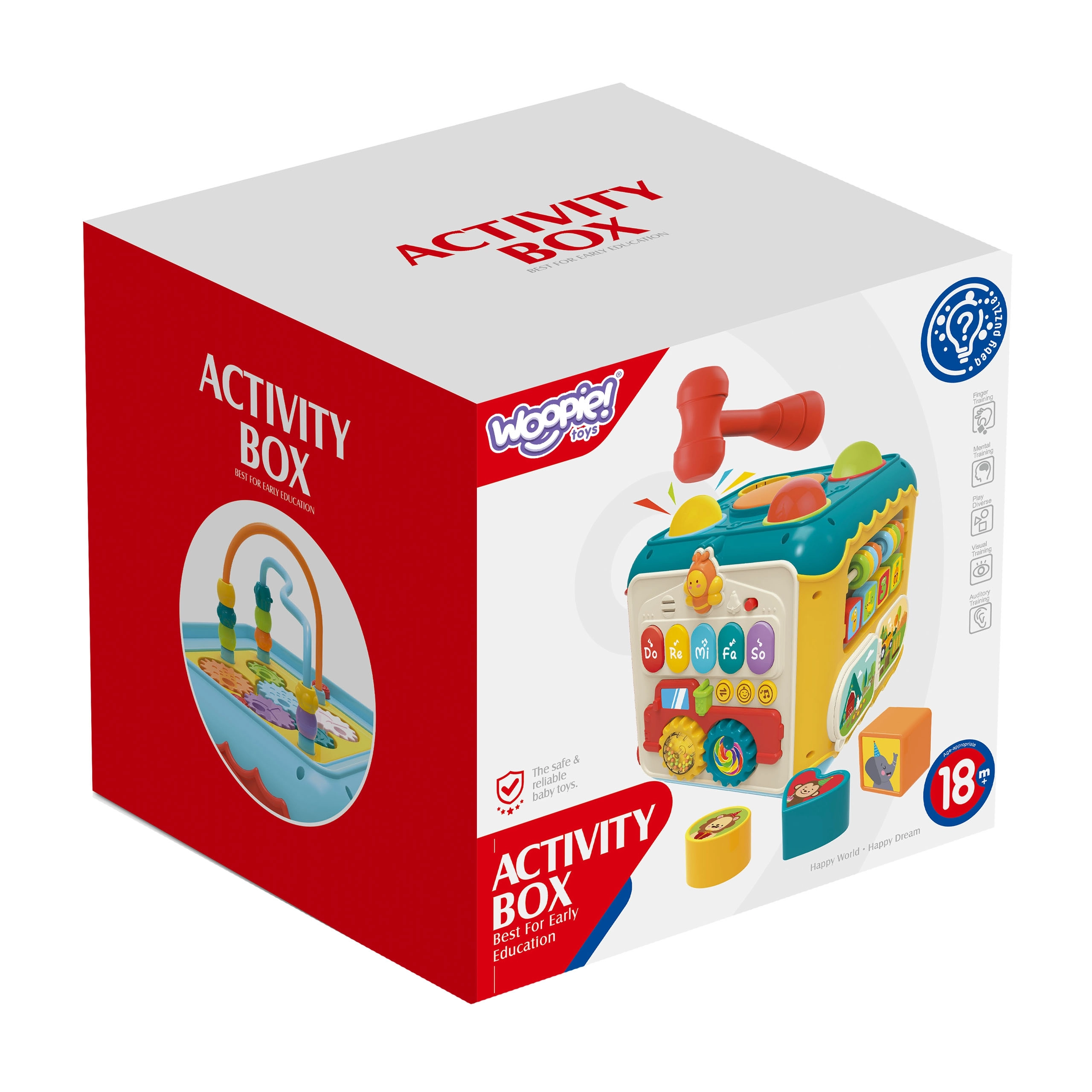 Cubo de actividades multifuncional 6 en 1 de la marca WOOPIE que ofrece a los más pequeños diversión variada y aprendizaje en uno. Cada lado propone una actividad diferente: piano con sonidos, golpear pelotas con martillo, laberinto, clasificador de formas con puertas y cerradura, ensartado y reloj con sonajero. El juguete desarrolla la motricidad fina, la coordinación ojo–mano, el reconocimiento de colores, formas y sonidos y fomenta la curiosidad y la creatividad. Sus dimensiones compactas garantizan un transporte sencillo y diversión sin fin en viajes y en casa.