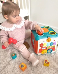 Descubre una actividad lúdica y educativa para los más pequeños con el cubo WOOPIE 6 en 1. Cada cara aporta una forma distinta de aprender a través del juego: desde el piano sonoro hasta golpear pelotas de colores y el clasificador lógico de formas. Al manipular los elementos, los niños fortalecen de forma natural la motricidad fina, la percepción sensorial y la imaginación.