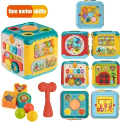 - 6 en 1 (piano, golpear pelotas con martillo, clasificador de formas y puertas con cerradura, laberinto, ensartado, reloj con sonajero)