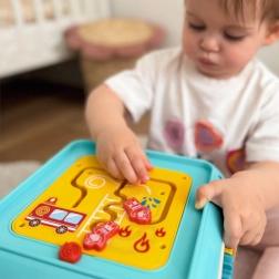 Botones, ruedas, formas y el martillo motivan a los niños a agarrar y moverse con precisión. Desarrollan la coordinación ojo–mano y la percepción sensorial.