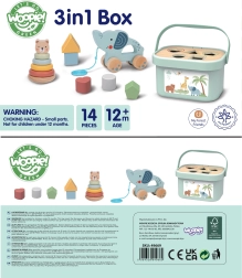 Este versátil set impulsa el desarrollo infantil a través del juego: los niños introducen las formas en la tapa–clasificador, apilan los aros de colores vivos en la varilla de la pirámide con osito y entrenan la marcha y la coordinación con el elefante de arrastre. Tras jugar, todo se guarda en la caja con tapa y asa, para tener el orden listo en un instante.