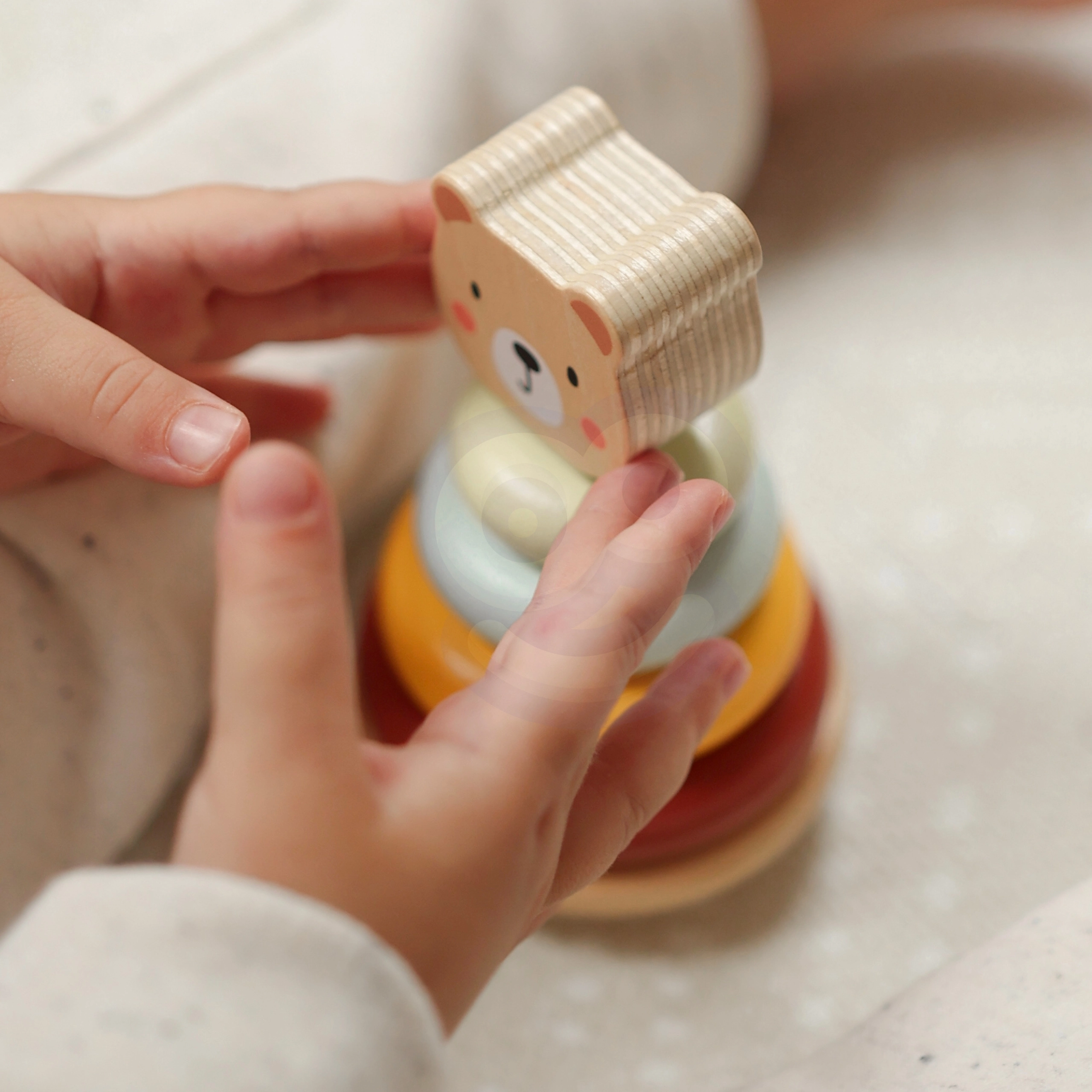 Los aros de colores se colocan fácilmente y fomentan la coordinación ojo–mano, la percepción de las tamaños y la paciencia. El adorable osito motiva a seguir intentándolo.
