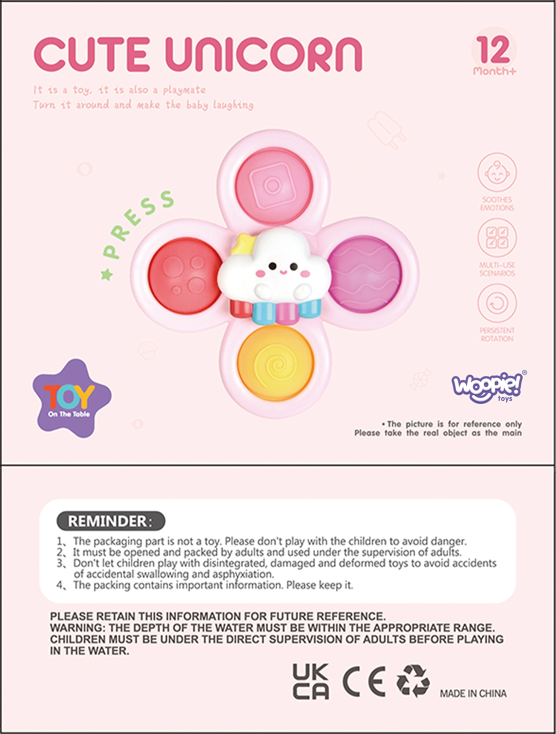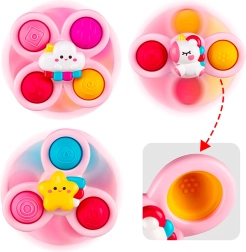 Con este set de tres spinners de la marca WOOPIE, tu hijo quedará encantado. El set incluye spinners con forma de unicornio, estrella y nube. Los spinners pueden colocarse en distintas superficies, como ventanas o la bañera durante el baño, el juguete es resistente al agua. Los rodamientos garantizan una rotación de larga duración y las piezas desmontables permiten una creatividad infinita al combinarlas. Incluye partes de goma con superficies variadas que estimulan los sentidos y ayudan a aliviar el estrés.