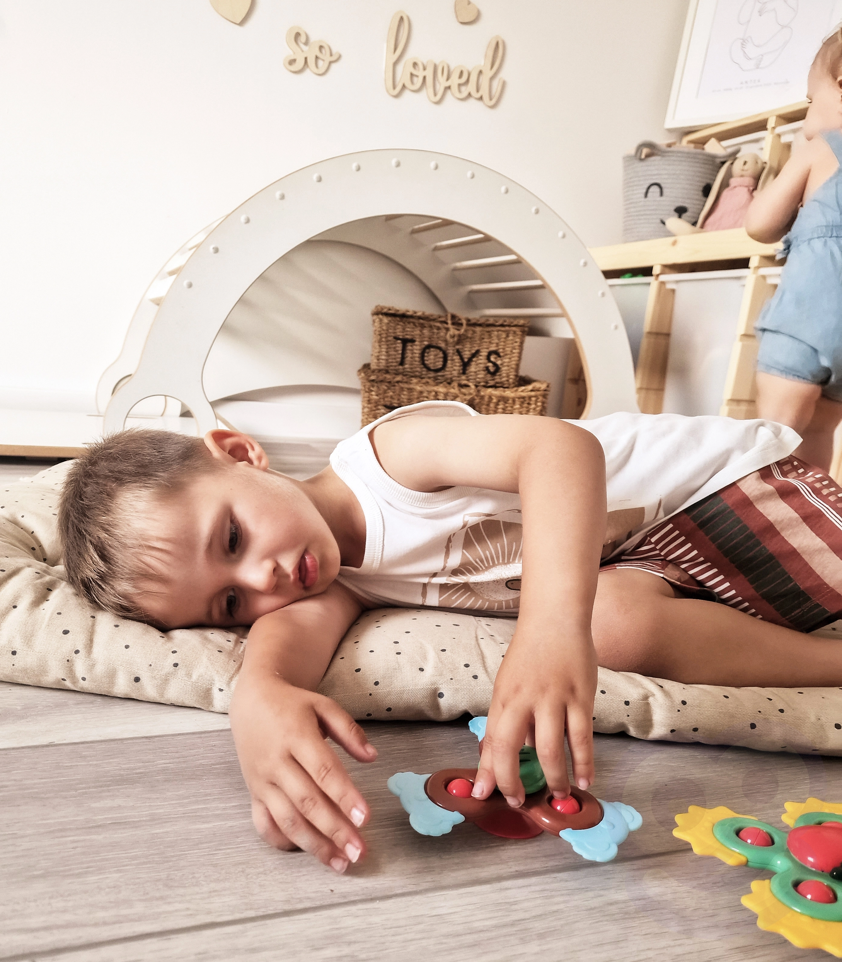 El set de tres spinners de colores WOOPIE es un juguete sensorial ideal para niños a partir de 18 meses. Gracias a sus resistentes ventosas, se colocan fácilmente sobre superficies lisas —cristal, bañera y mesa—, creando una actividad divertida y segura en cualquier lugar. Los spinners tienen elementos de goma en relieve y anillos para girar que estimulan el tacto, la vista y la concentración.