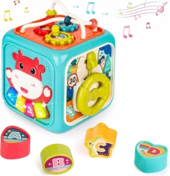Además de las funciones musicales, el cubo incluye encajables con 4 formas y letras, reloj giratorio, engranajes, volante con cochecito y un laberinto de bolitas. El plástico robusto, bordes redondeados y pinturas no tóxicas garantizan un juego seguro desde los primeros meses. Alimentación mediante 3× AA (no incluidas).