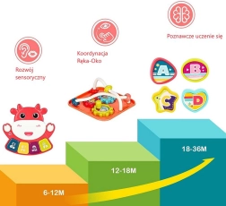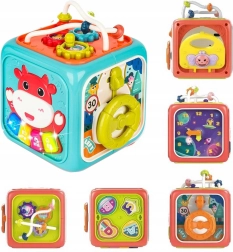 - 6 en 1 (música, canciones, juego de reflejos, sonidos de animales, encajables, elementos mecánicos)
