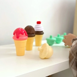 El juego de heladería desarrolla la imaginación y la creatividad infantil, permitiendo al niño asumir el papel de pastelero y cliente. Incluye todas las piezas necesarias para crear la experiencia heladera perfecta. El niño toma un cucurucho, sirve una bola de helado y la combina según su propia creatividad.