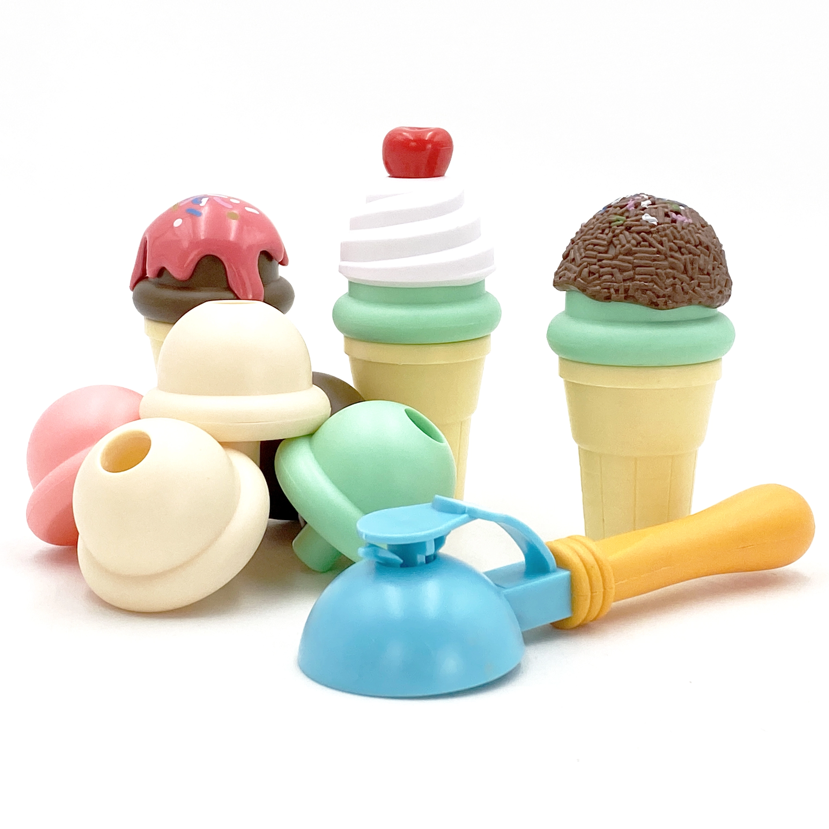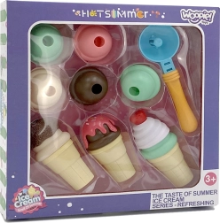 Contiene 15 piezas, incluidos cucuruchos, bolas y cuchara para helado.