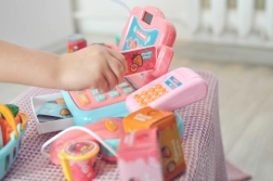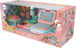 La caja registradora infantil WOOPIE es ideal para pequeños vendedores a partir de 3 años. El set incluye 24 accesorios, entre ellos cesta, frutas y verduras, bebidas, helado, dinero de juguete y tarjeta de pago. Elementos realistas como lector, báscula, micrófono y terminal de pago crean una experiencia de compra auténtica.