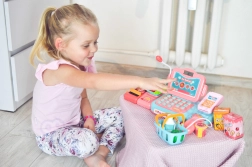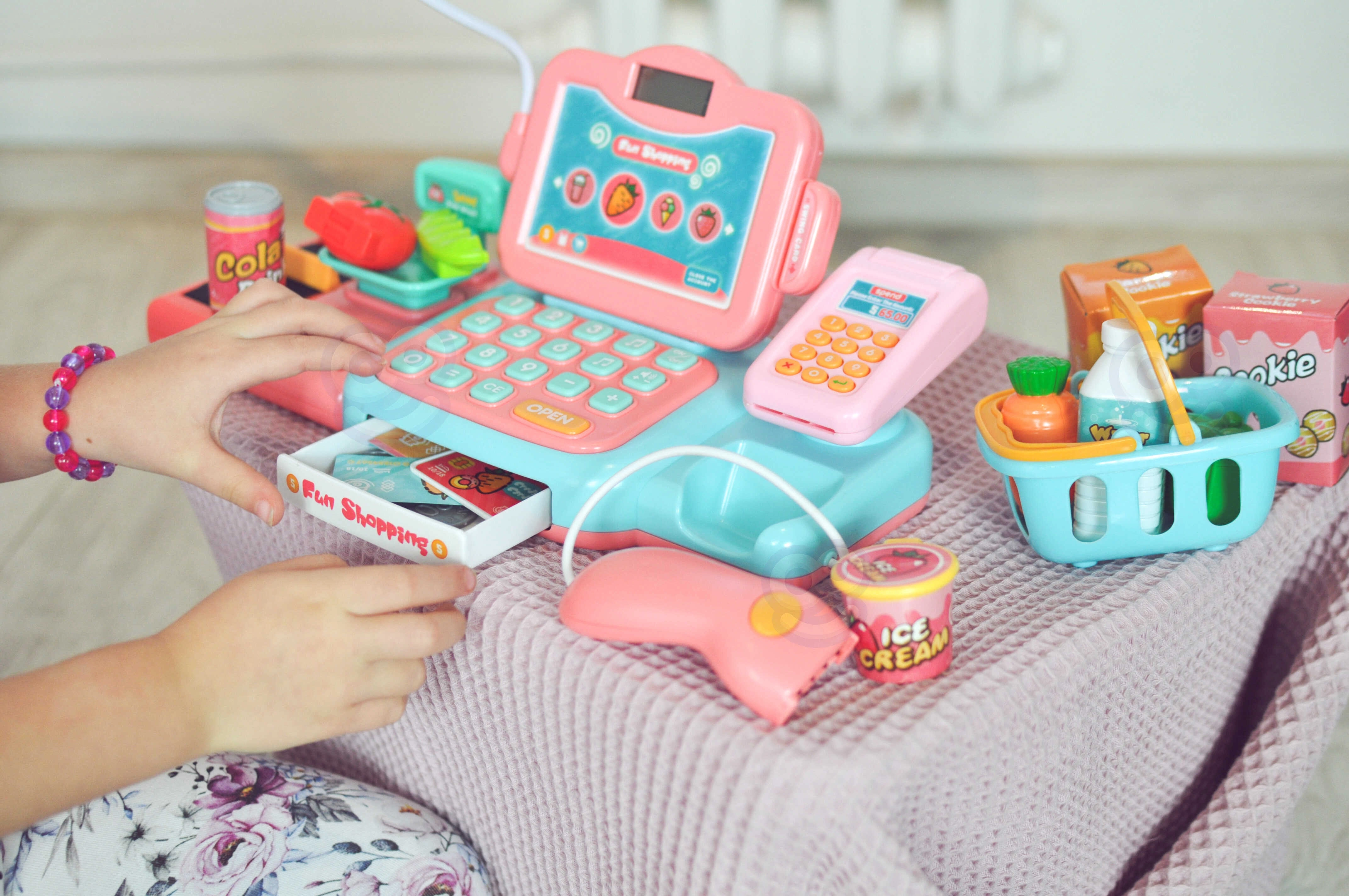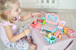 El teclado funcional, el cajón de dinero y el terminal permiten a los niños introducir precios y elegir el pago en efectivo o con tarjeta.