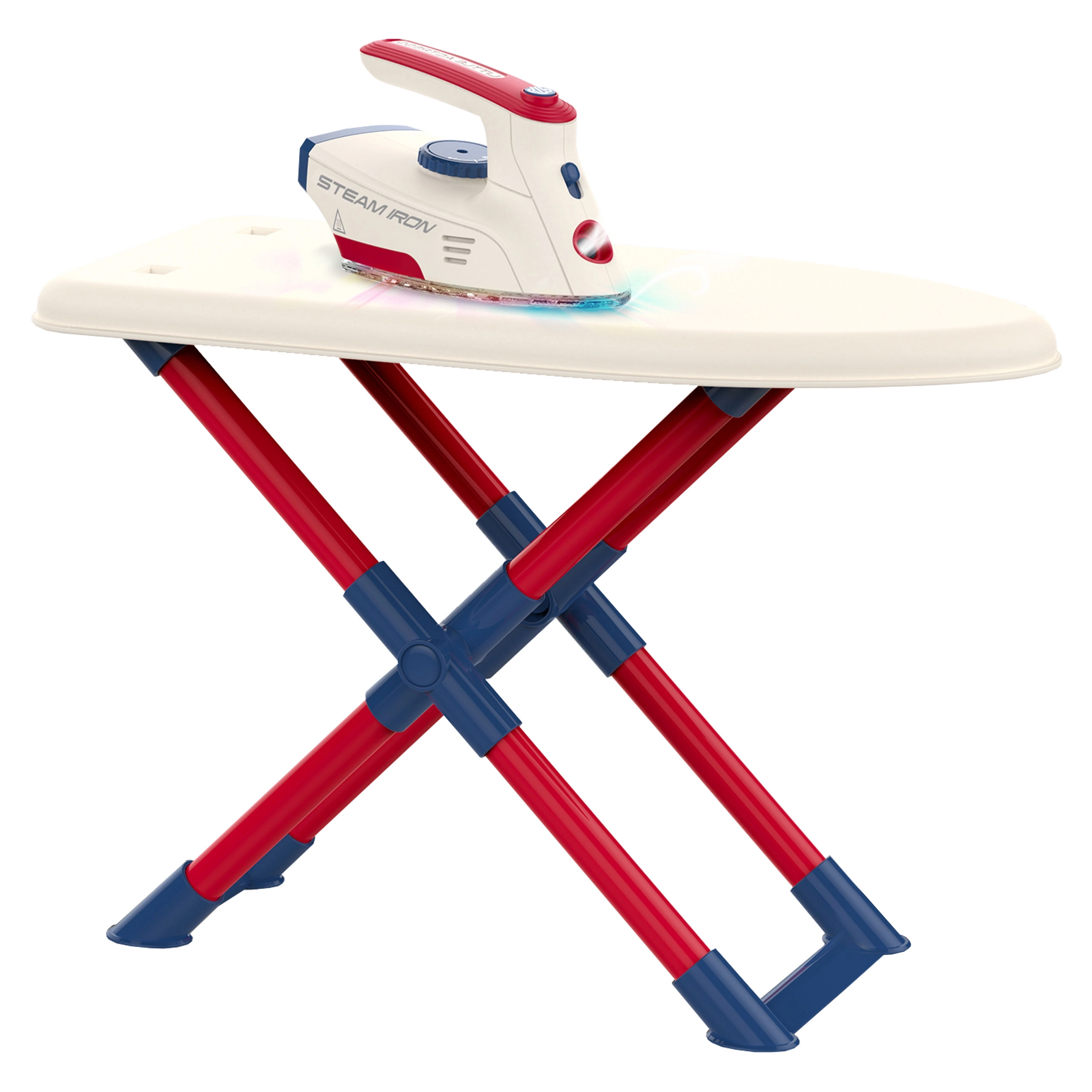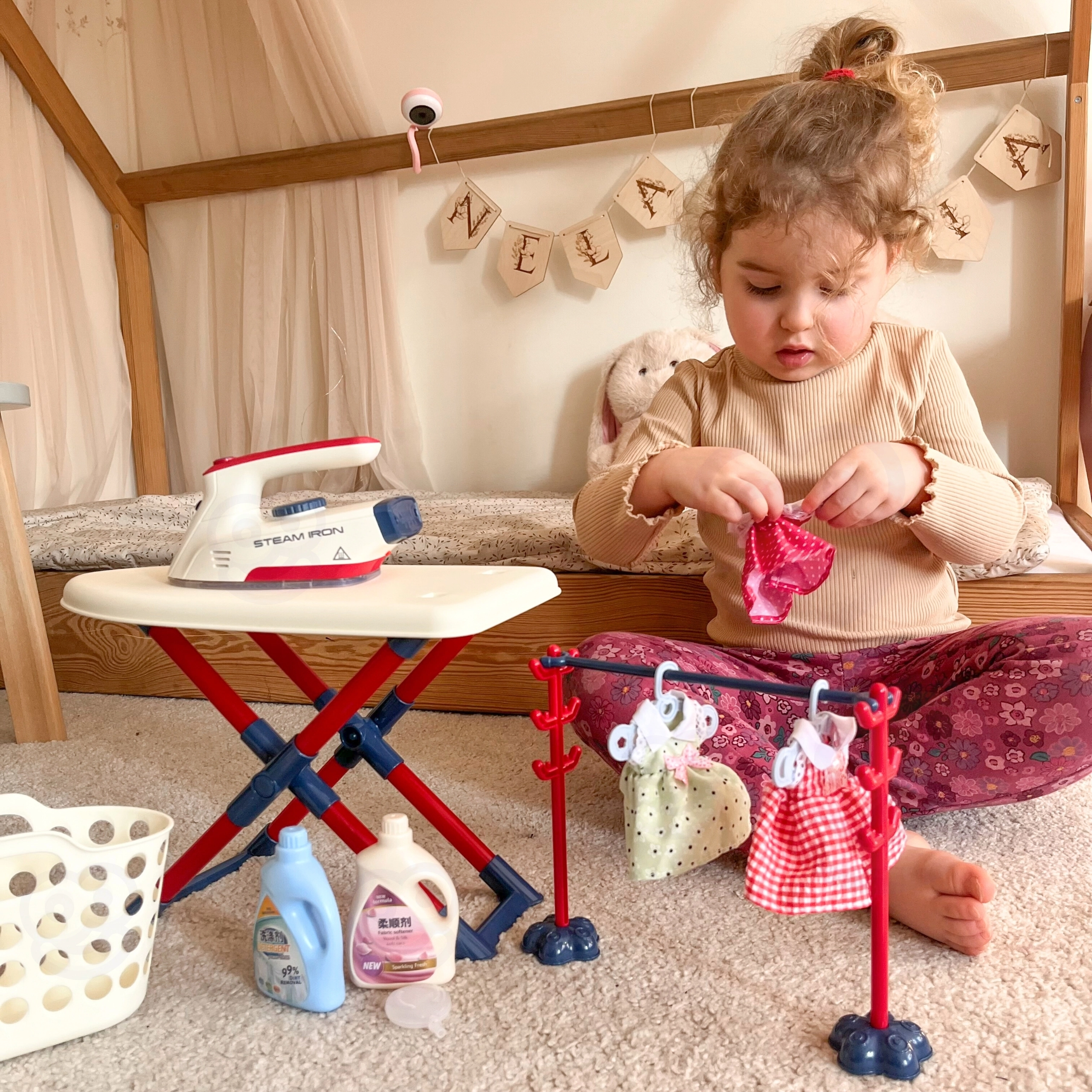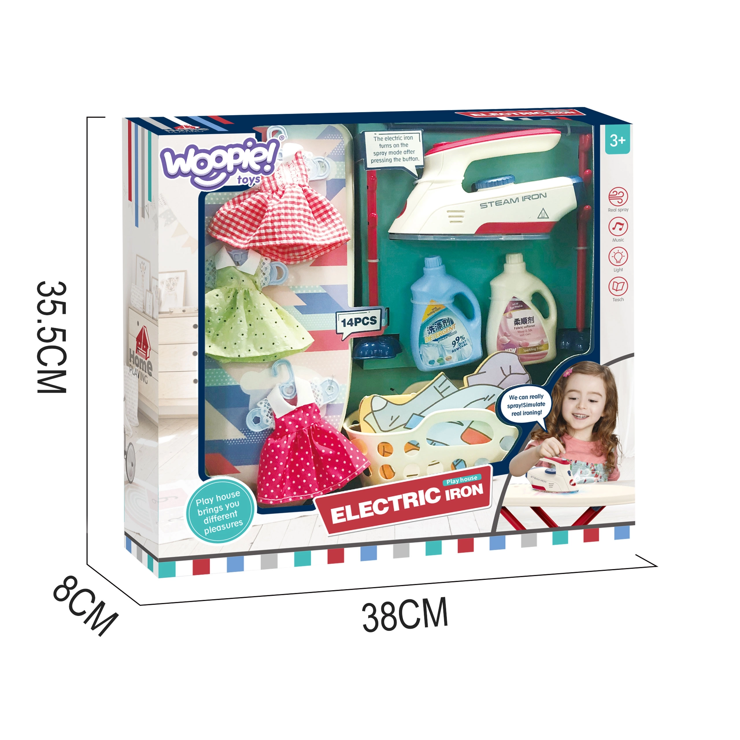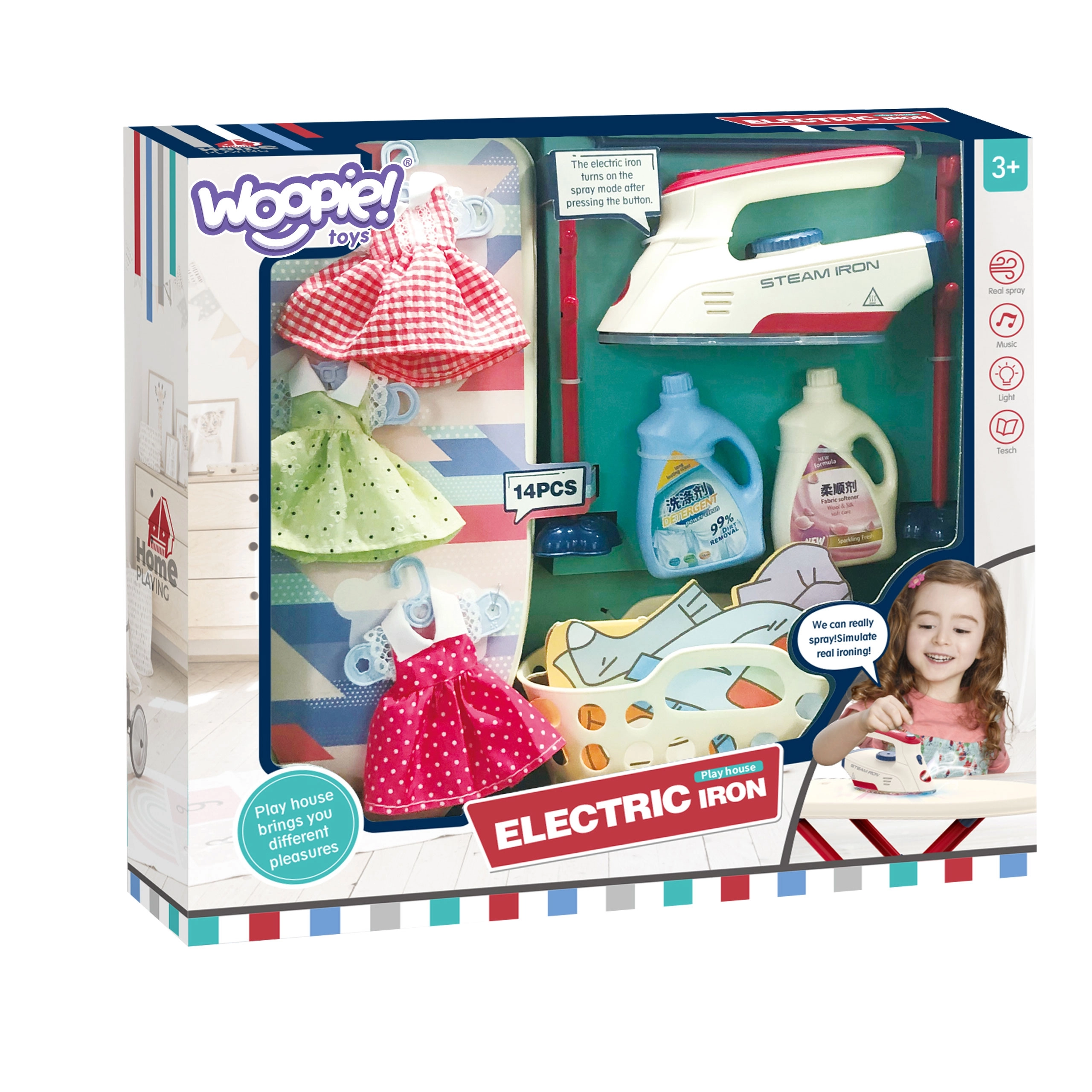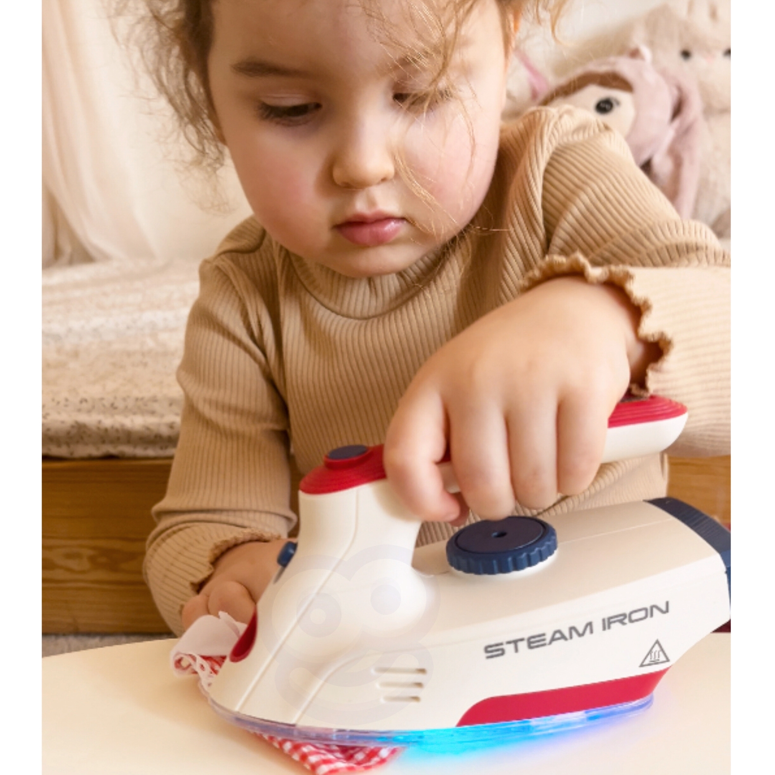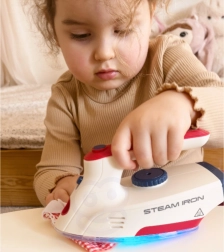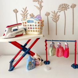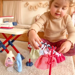 La plancha es un juguete seguro para niños, ya que no se calienta, pero está equipada con múltiples funciones que dan vida al juego: botón para imitar los sonidos reales del planchado, luz LED y efectos de sonido en forma de canciones. Este set es ideal para niños a los que les gusta imitar a sus padres en las tareas cotidianas.