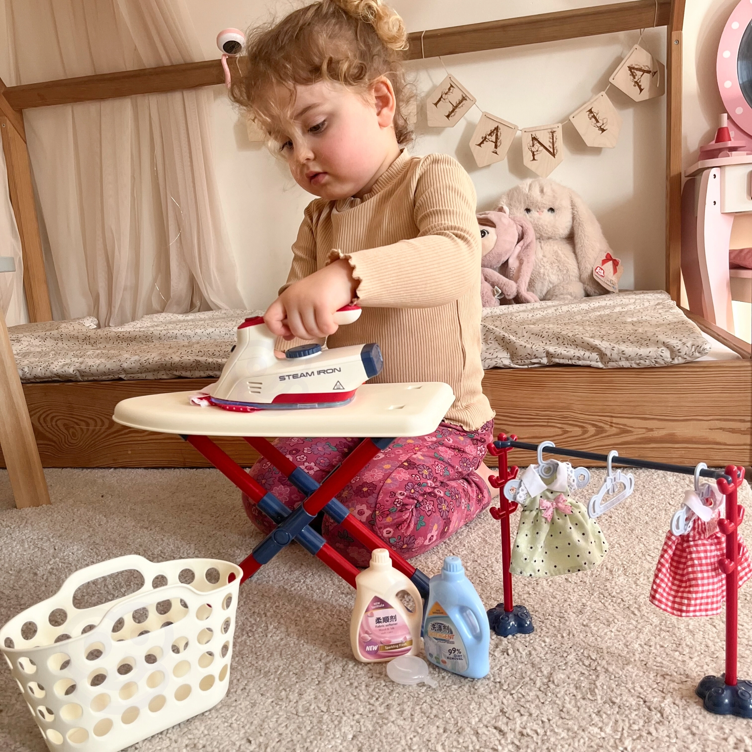 Juego de planchado para niños de la marca Woopie que aportará a tu hijo mucha diversión jugando a ser pequeño ama de casa. Incluye plancha, tabla de planchar, cesta para la ropa y incl. perchas y ropa para muñecas, todo seguro y adaptado a las necesidades infantiles.