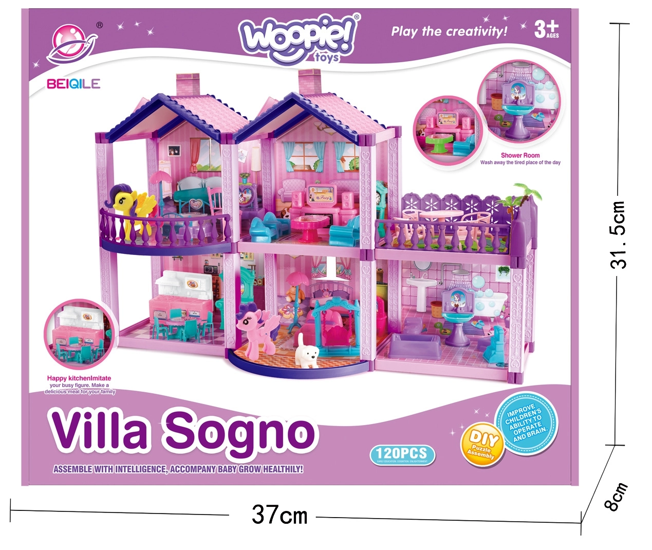 Mágica casita de muñecas de plástico de la marca WOOPIE, una villa de dos pisos con abundantes accesorios y 120 piezas para un juego creativo sin fin. El set incluye 2 ponis, un perrito, muebles y decoraciones. No faltan salón, cocina con comedor, dos dormitorios, baño y balcón. Acabado de calidad, materiales seguros y colores vivos que encantarán a niños a partir de 3 años.