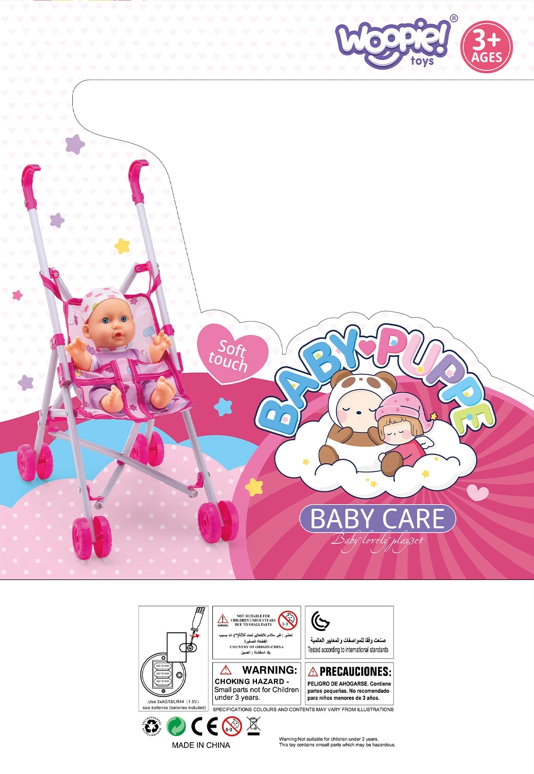 La Primera muñeca Bebé con cochecito y set de alimentación de la marca WOOPIE es la elección ideal para un niño que quiere imitar a los adultos en el cuidado de los bebés. La muñeca emite sonidos como mamá, papá, llanto y risa, lo que añade realismo al juego. El niño puede alimentar a la muñeca o llevarla de paseo en el cochecito incluido.
