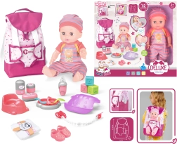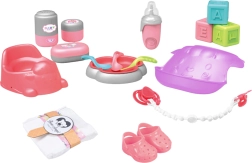 El set contiene todos los accesorios necesarios para el cuidado de la muñeca. Los niños encontrarán aquí un set de alimentación, accesorios para cambiar y muchos otros juguetes. La muñeca incluso puede hacer pis en el orinal, lo que añade un toque más realista al juego.