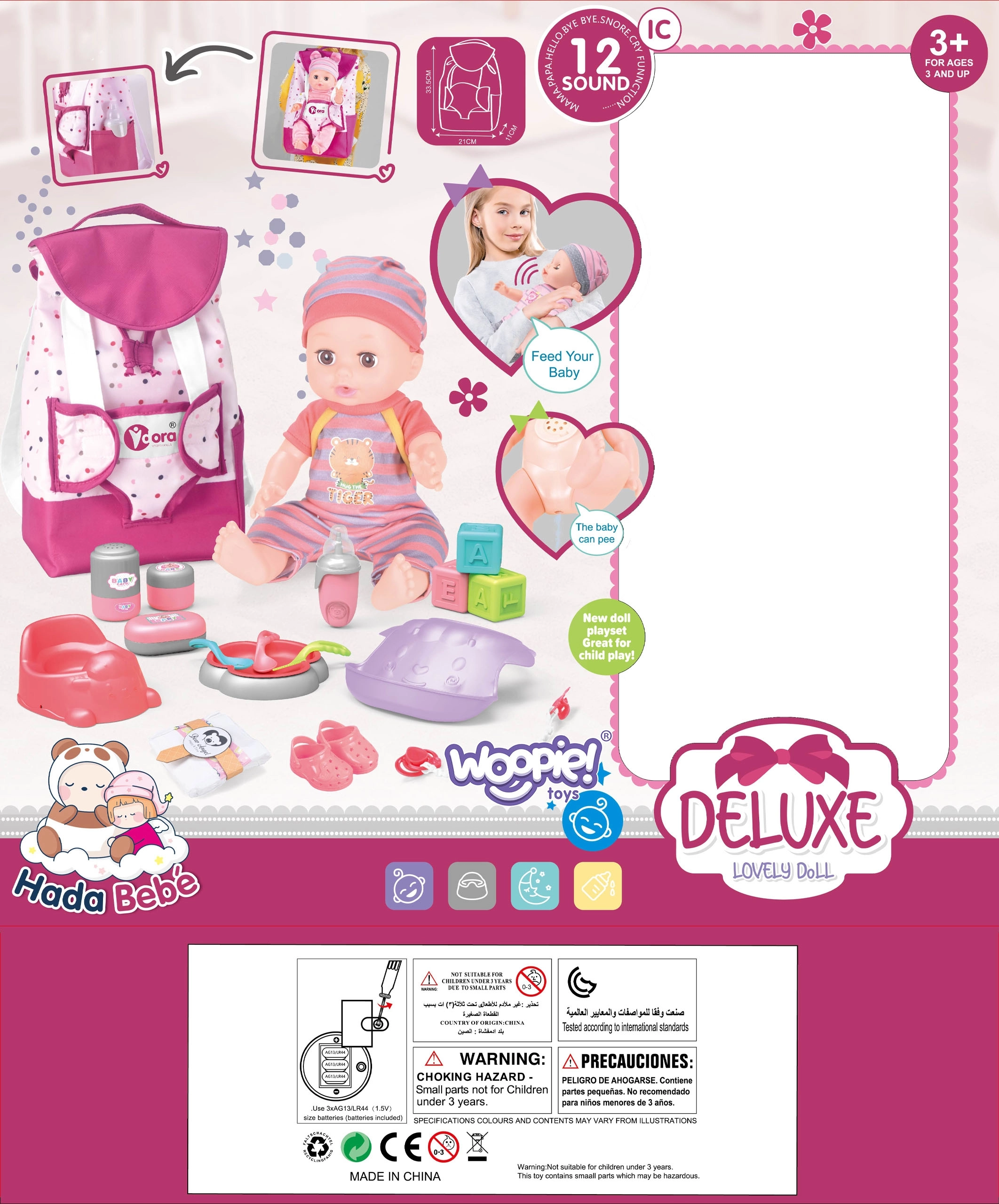 La muñeca también emite 12 sonidos característicos como “mamá”, “papá”, llanto, risa, estornudos y balbuceos, lo que encantará a cualquier niño.