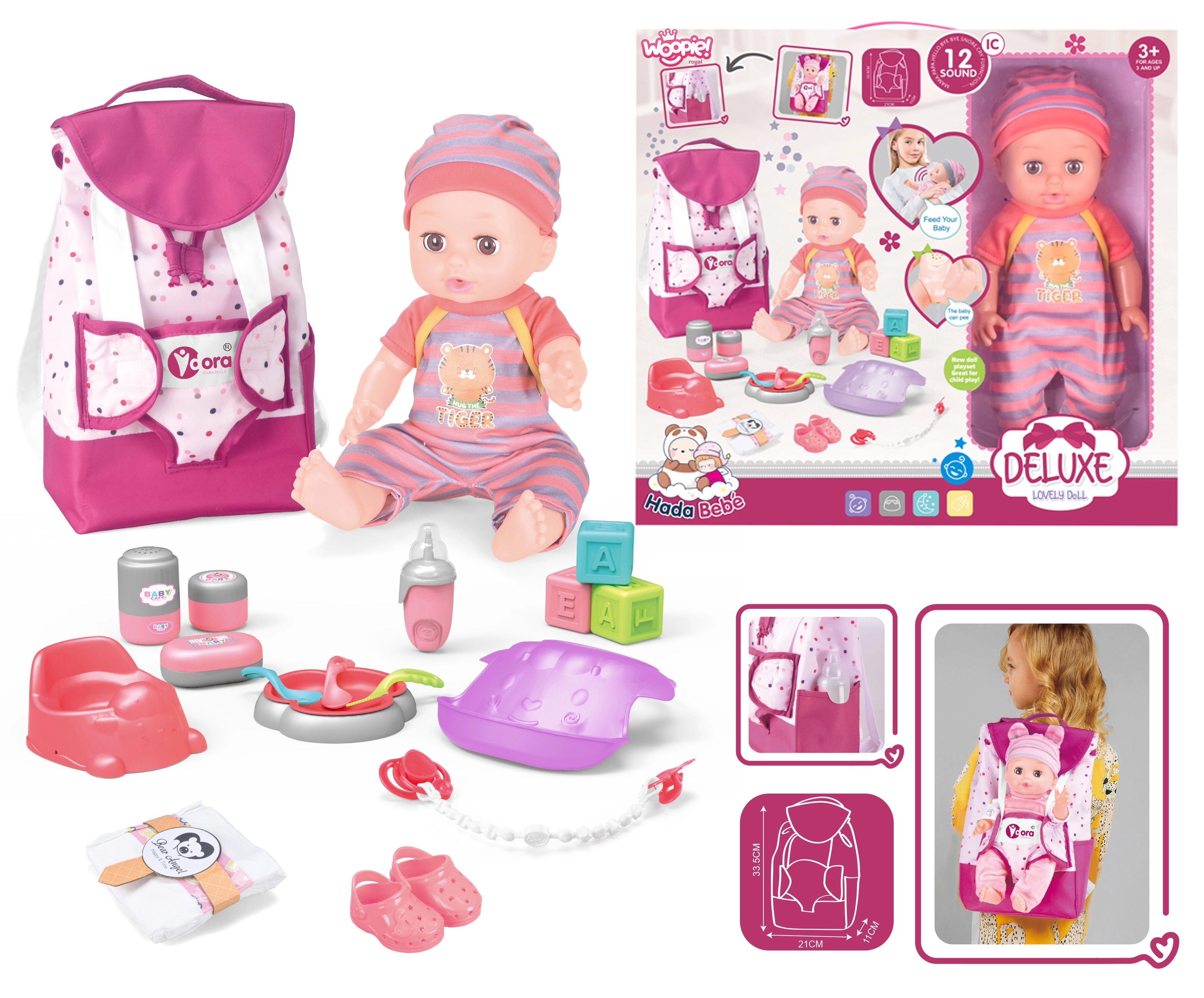 El set incluye todos los accesorios necesarios para alimentar, cambiar y vestir, lo que potencia la creatividad y el cuidado de la muñeca.
