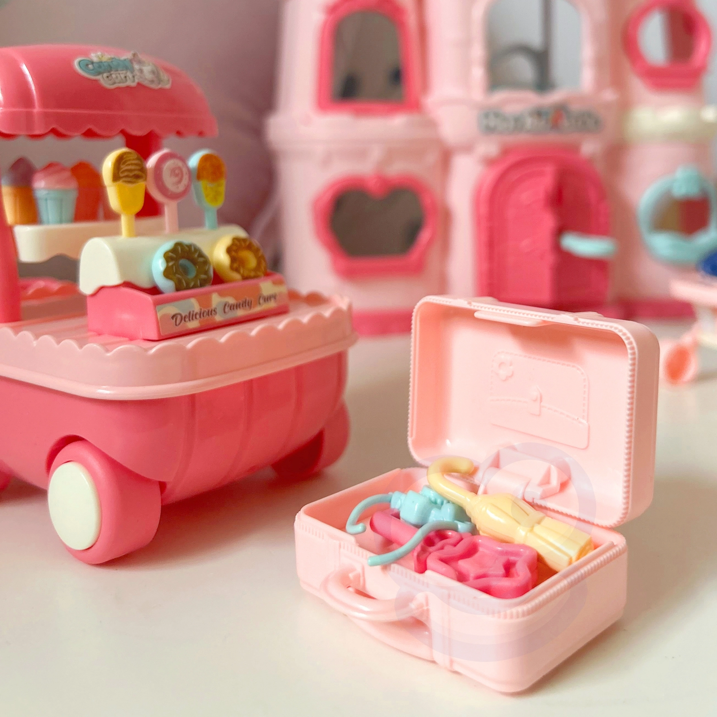 - Cochecito rosa, carrito de helados y golosinas, maletín, bollo/almohada para dormir, paraguas, cámara de fotos, 2 relojes, llaves