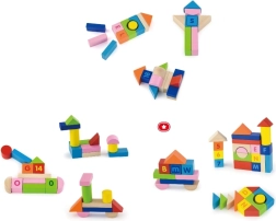 Los bloques están hechos de madera de alta calidad y pintados con pinturas no tóxicas. Los bordes lisos y no afilados garantizan un juego seguro incluso para los más pequeños. El set incluye un empaque en cubo con cierre y asa, que sirve como caja práctica para guardar y transportar. Un folleto ilustrado inspirador ayuda a arrancar con ideas creativas.