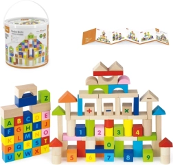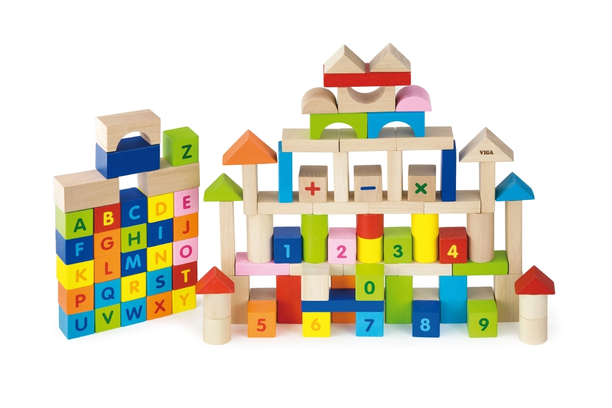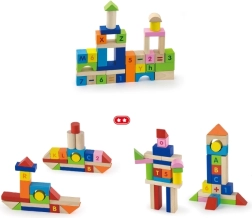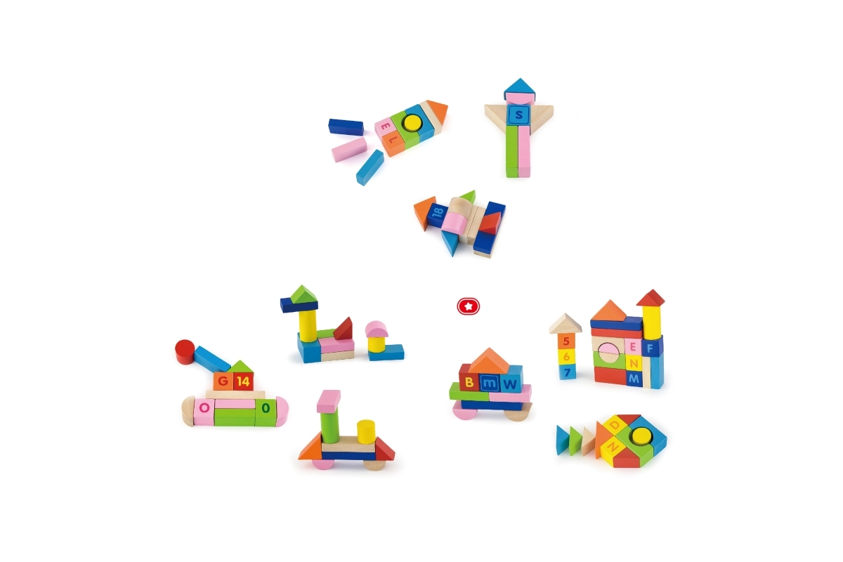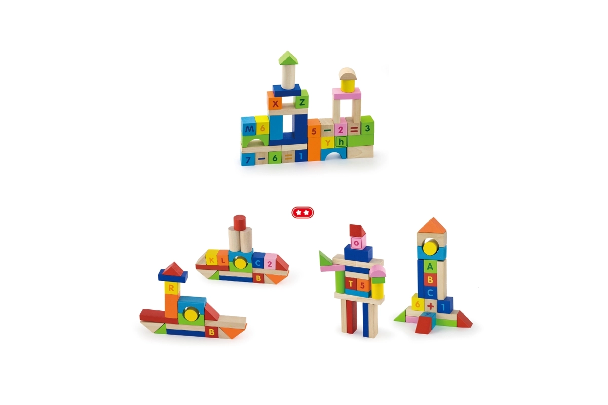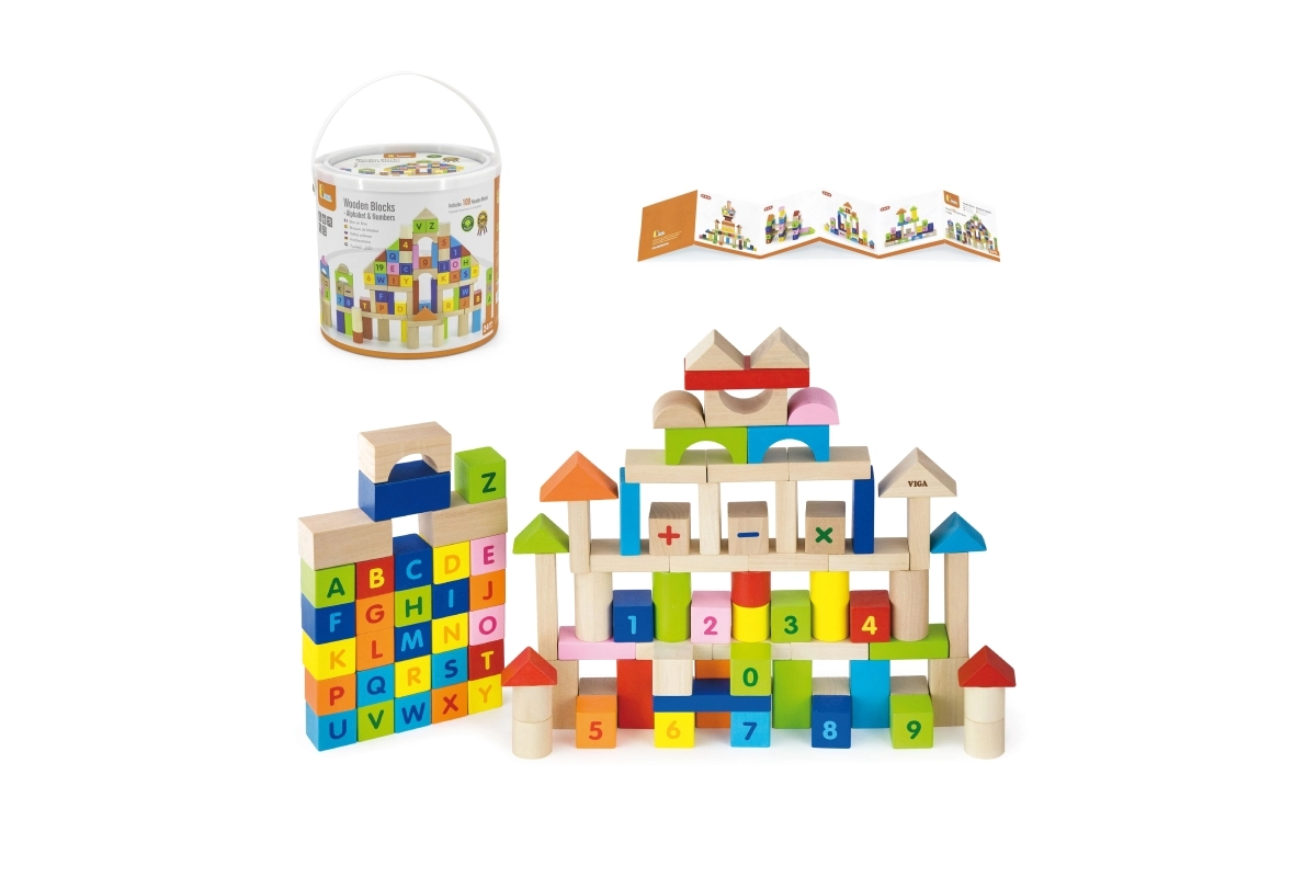 Este colorido set de 100 bloques de madera VIGA, inspirado en los principios MONTESSORI, brinda a los niños la alegría de descubrir letras, números y sencillas tareas de cálculo. Gracias a las diferentes formas — bloques, cilindros, arcos y techos — los niños pueden construir ciudades, torres y estructuras fantásticas mientras practican de forma natural el alfabeto, el conteo y los colores.