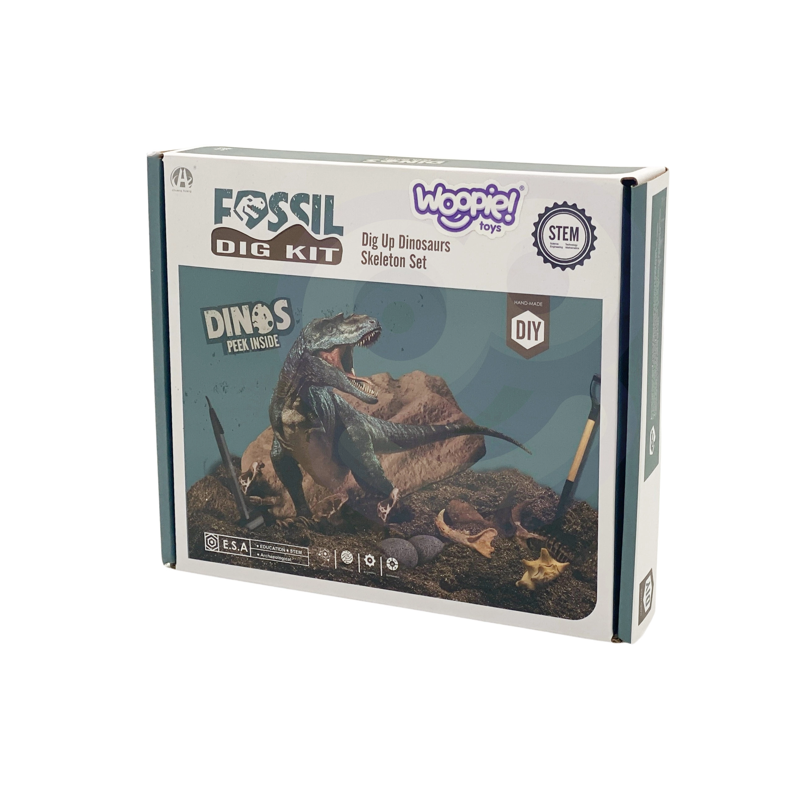 Un regalo excelente para niños que aman los dinosaurios. El set de excavación de la marca WOOPIE permite descubrir y desenterrar esqueletos de dinosaurios, estimulando el interés por la paleontología y la ciencia.
