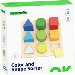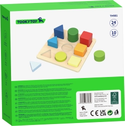 El rompecabezas de madera de la marca TOOKY TOY enseña a los niños a reconocer formas y colores y desarrolla la motricidad fina, el pensamiento lógico y la coordinación mano-ojo. El niño inserta 9 piezas de colores —triángulos, cuadrados y círculos— en las aberturas correctas del tablero. Diversión excelente y entrenamiento de la memoria y la concentración para los más pequeños.