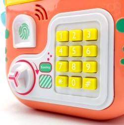 Guarda monedas y billetes por ranuras independientes, establece una contraseña y ábrela con el dial giratorio. Ideal para los primeros pasos hacia la educación financiera.