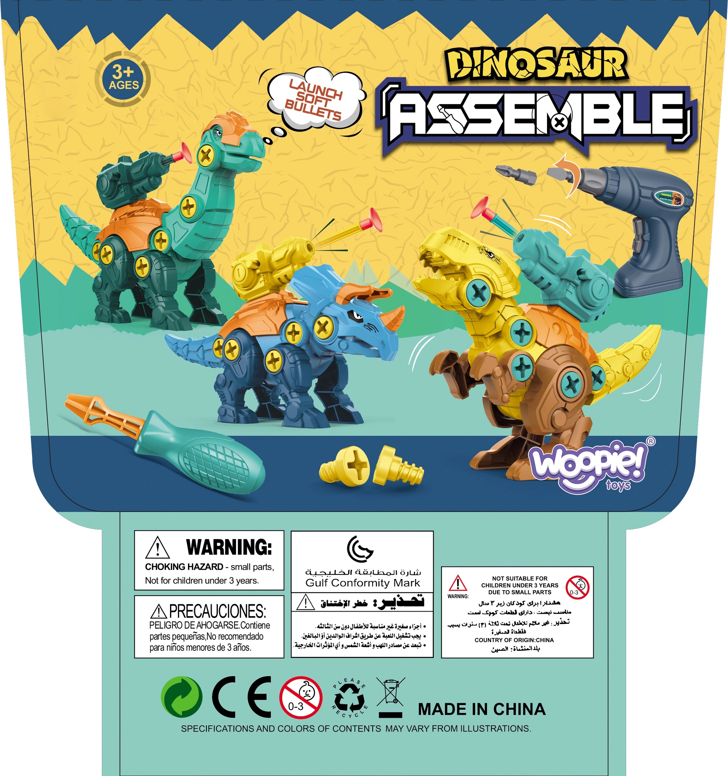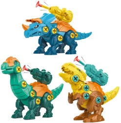 - 3 dinosaurios para ensamblar: piezas de colores, tornillos y articulaciones móviles.