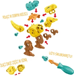 Descubre el mundo creativo de la construcción con WOOPIE dinosaurios para ensamblar. El set incluye 3 dinosaurios de colores que los niños montan por sí mismos con la ayuda de un taladro y un destornillador con puntas intercambiables. Una vez montados, los dinosaurios tienen cabeza, cola y extremidades móviles para un juego aún más divertido. Un juguete ideal para el desarrollo de la motricidad fina, la paciencia y la creatividad, guardado en un práctico maletín portátil.