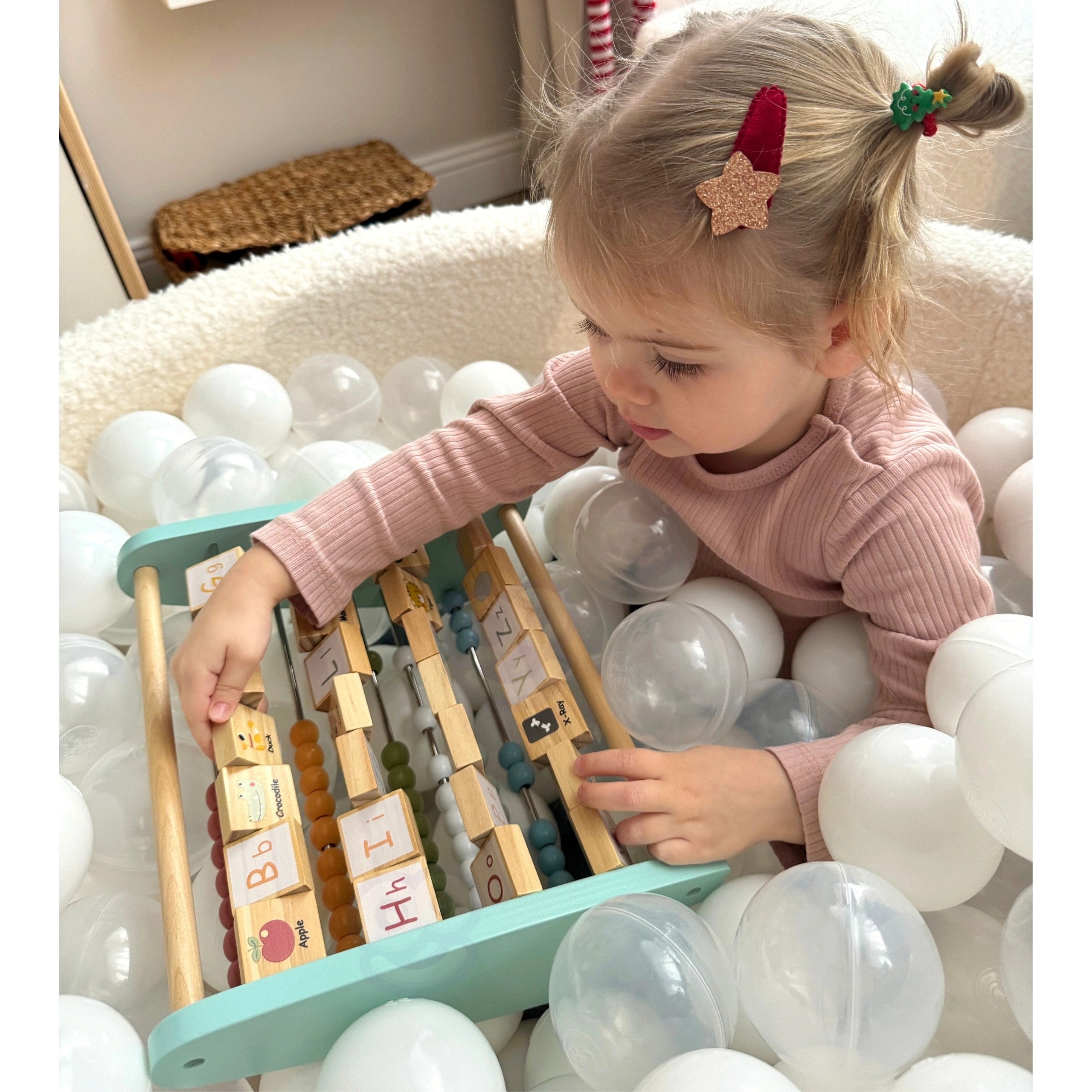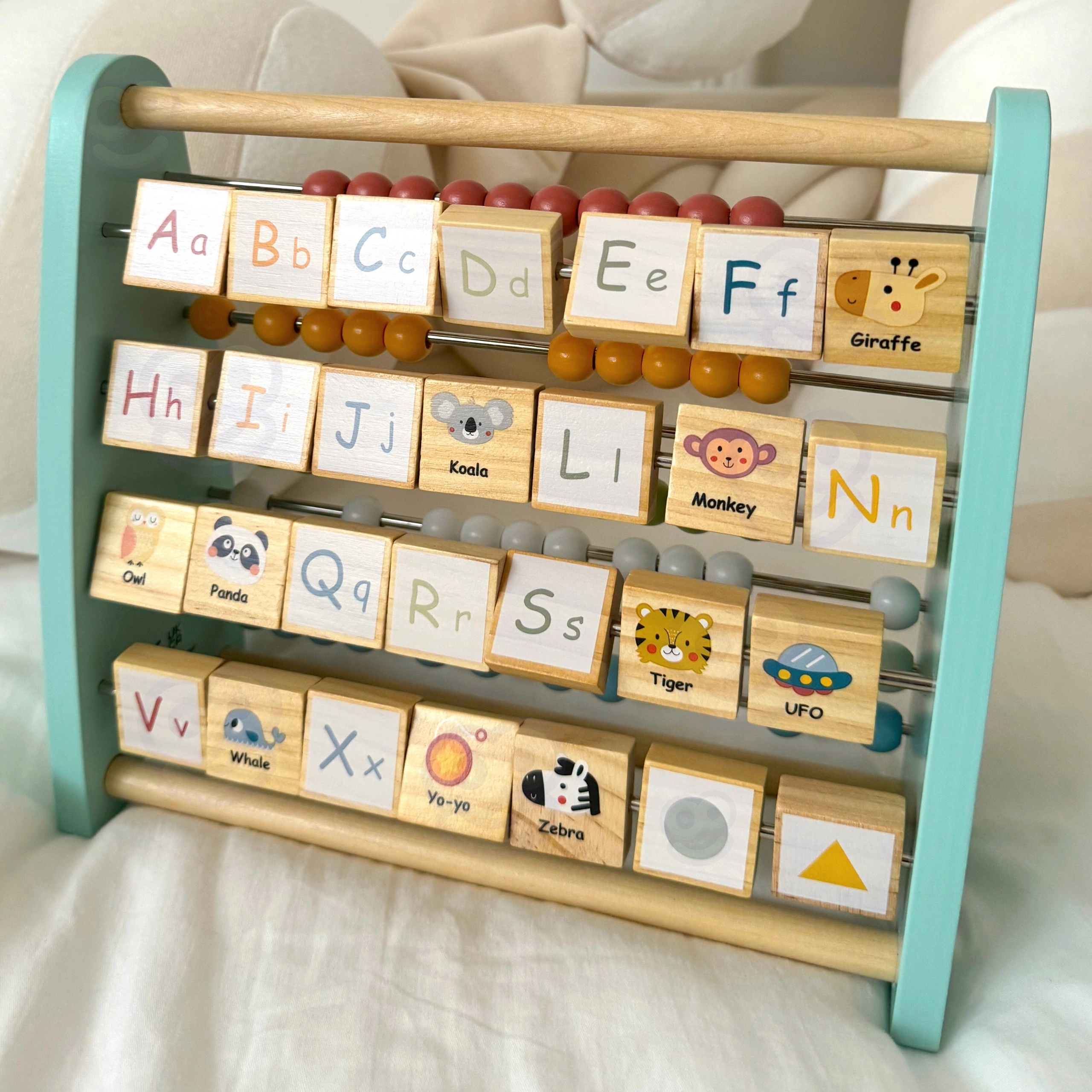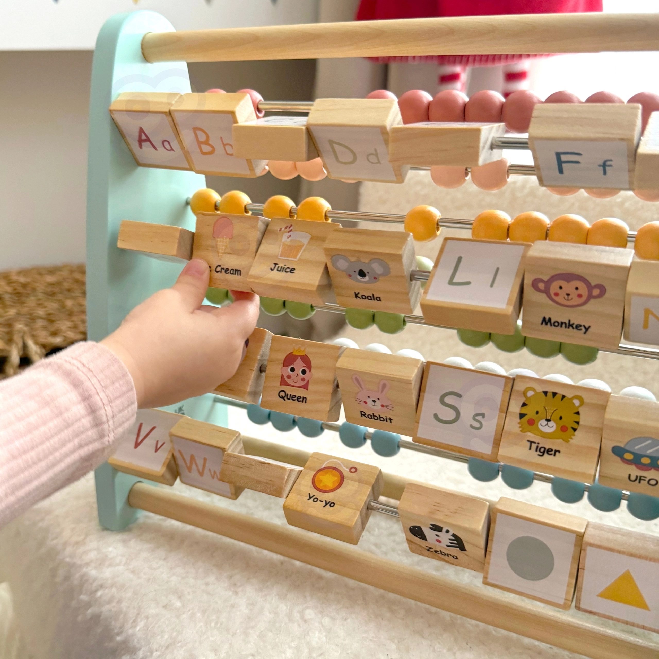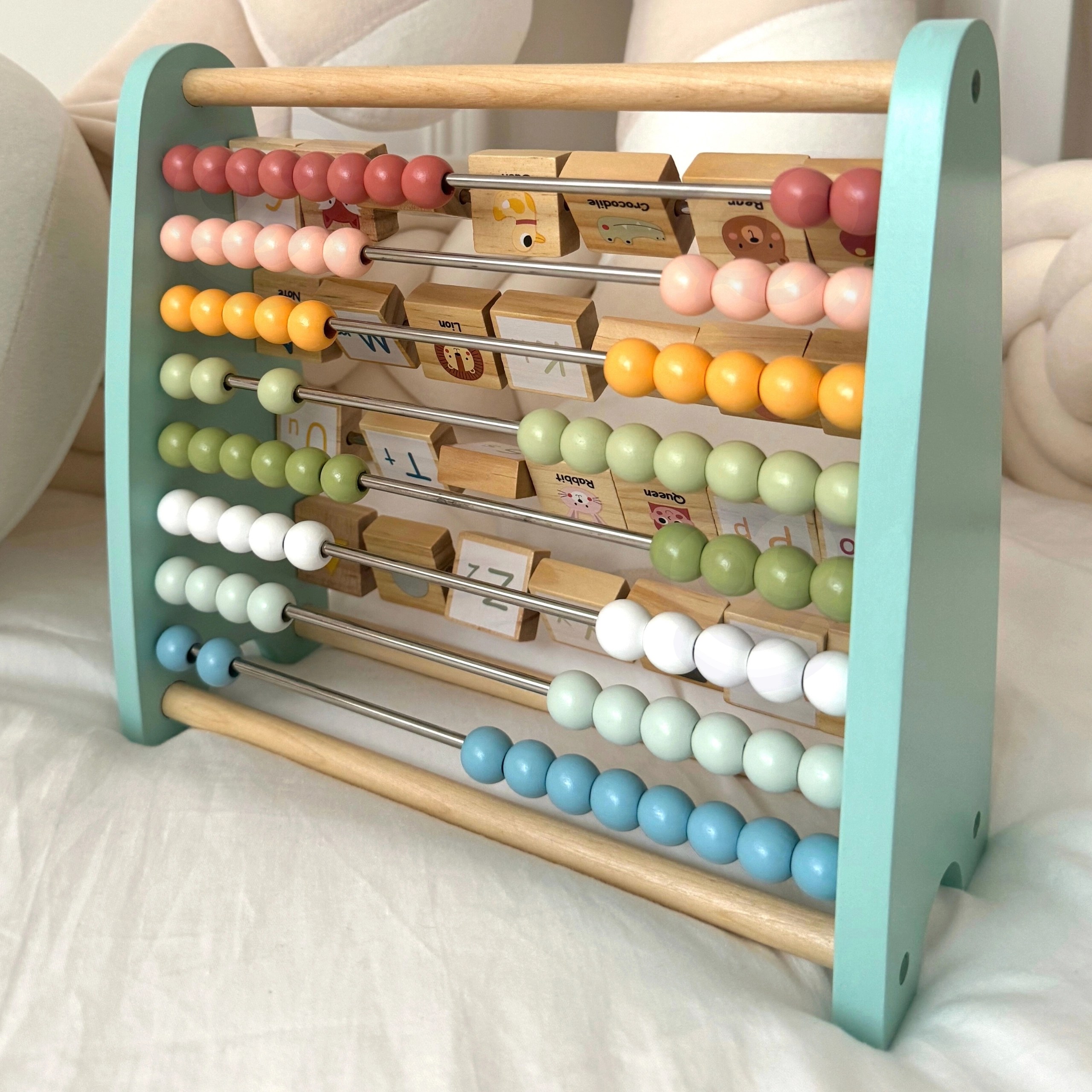 Un lado incluye un ábaco clásico con cuentas para contar, y el otro lado tiene bloques giratorios con letras del alfabeto e imágenes para un aprendizaje interactivo.