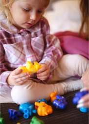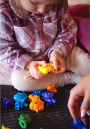 La imagen muestra juguetes de plástico de colores con forma de unicornios, diseñados para conectarse y construir figuras. Ayudan a desarrollar las habilidades motoras y la creatividad de los niños.
