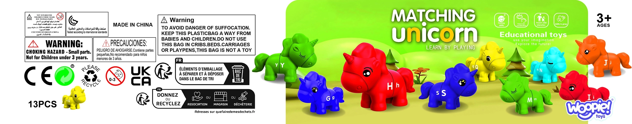 - El set contiene 13 unicornios: Cada uno con diferentes letras para fines educativos.