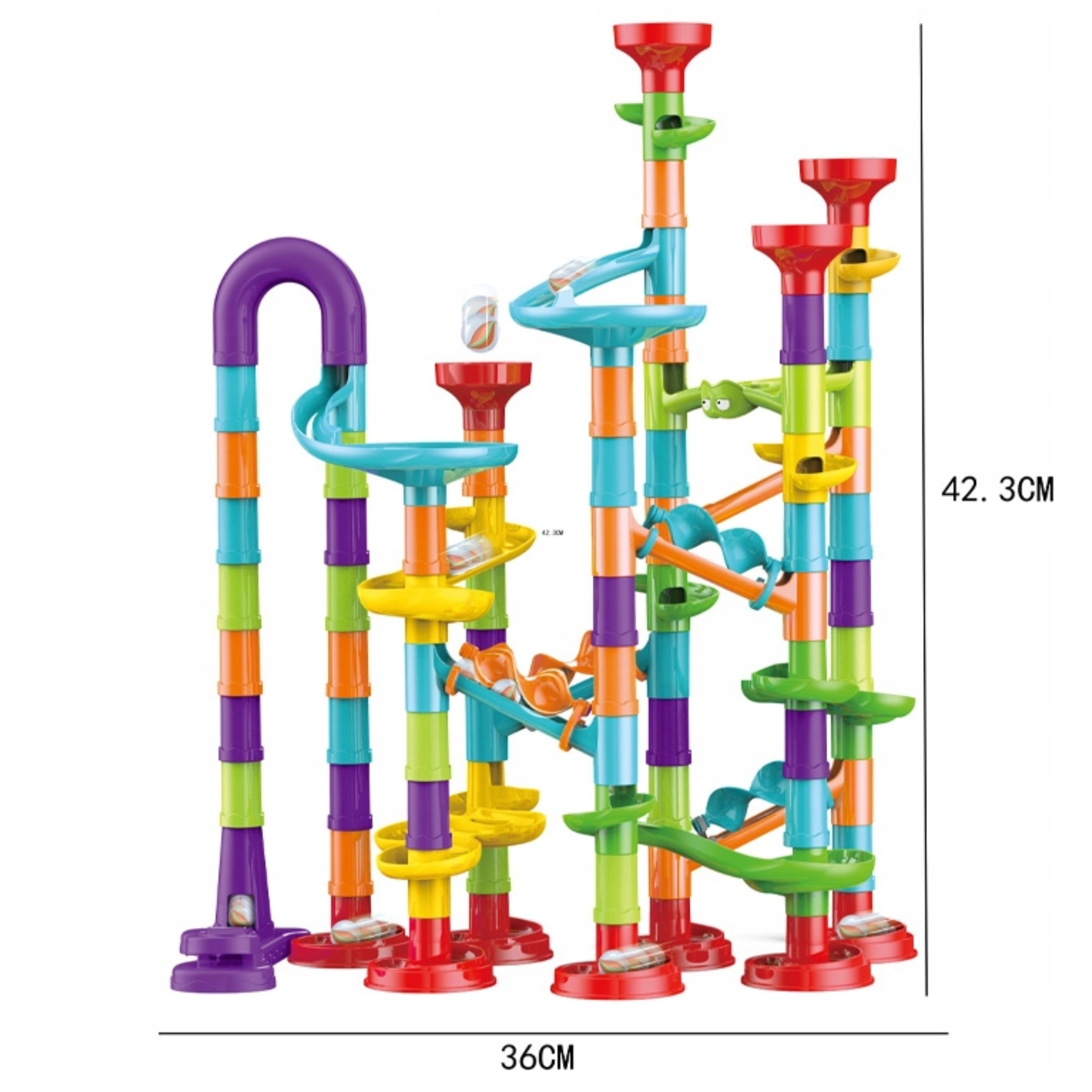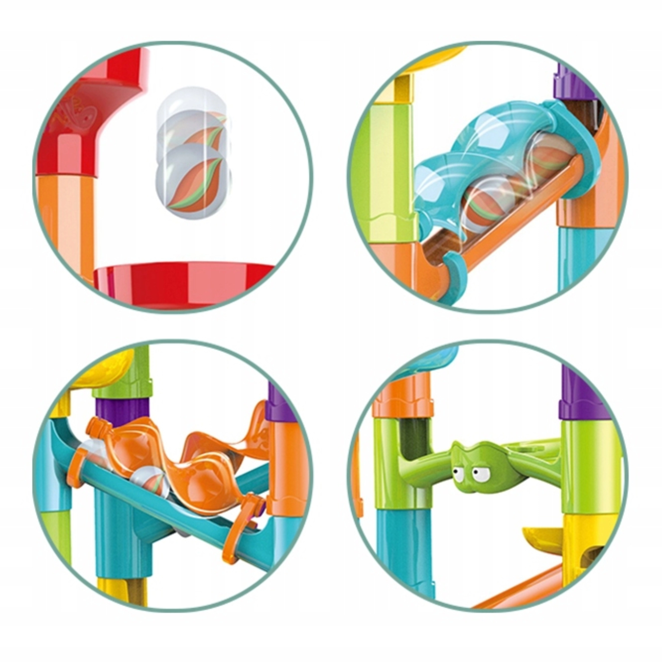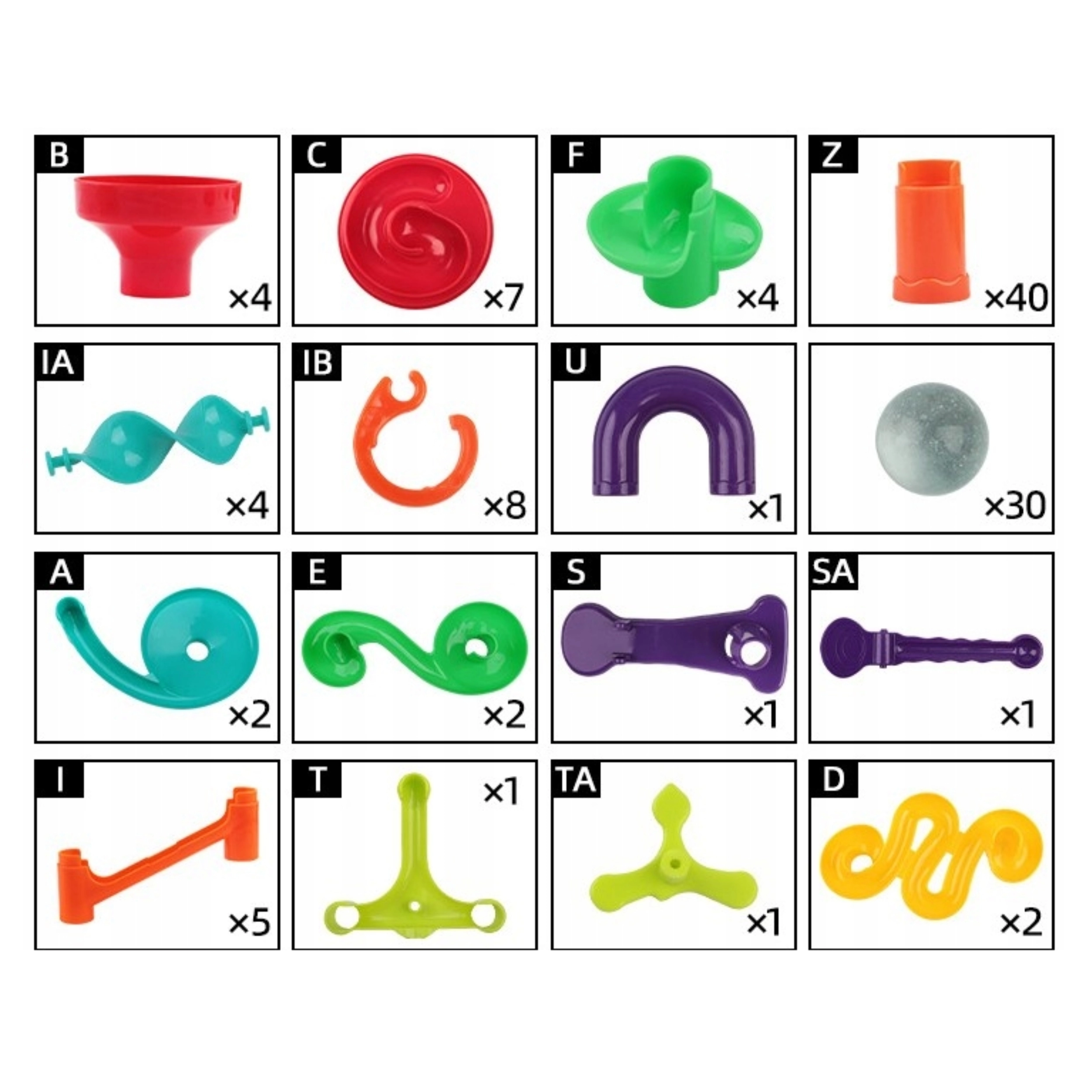 Diversos tubos, curvas, espirales, embudos y columnas permiten construir siempre una pista de canicas nueva y divertida. Construye siguiendo las instrucciones o crea tus propios recorridos ingeniosos.